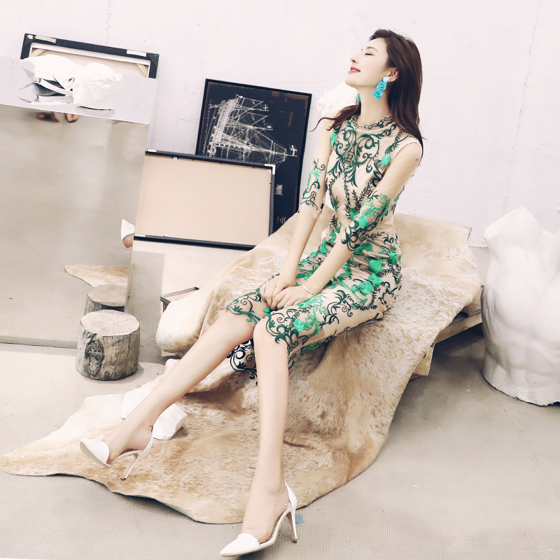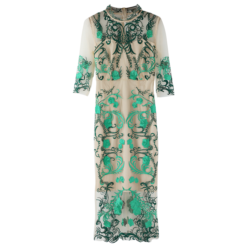 名媛氣質2018夏連衣裙女重工刺繡印花網紗裙超仙顯瘦性感氣質長裙