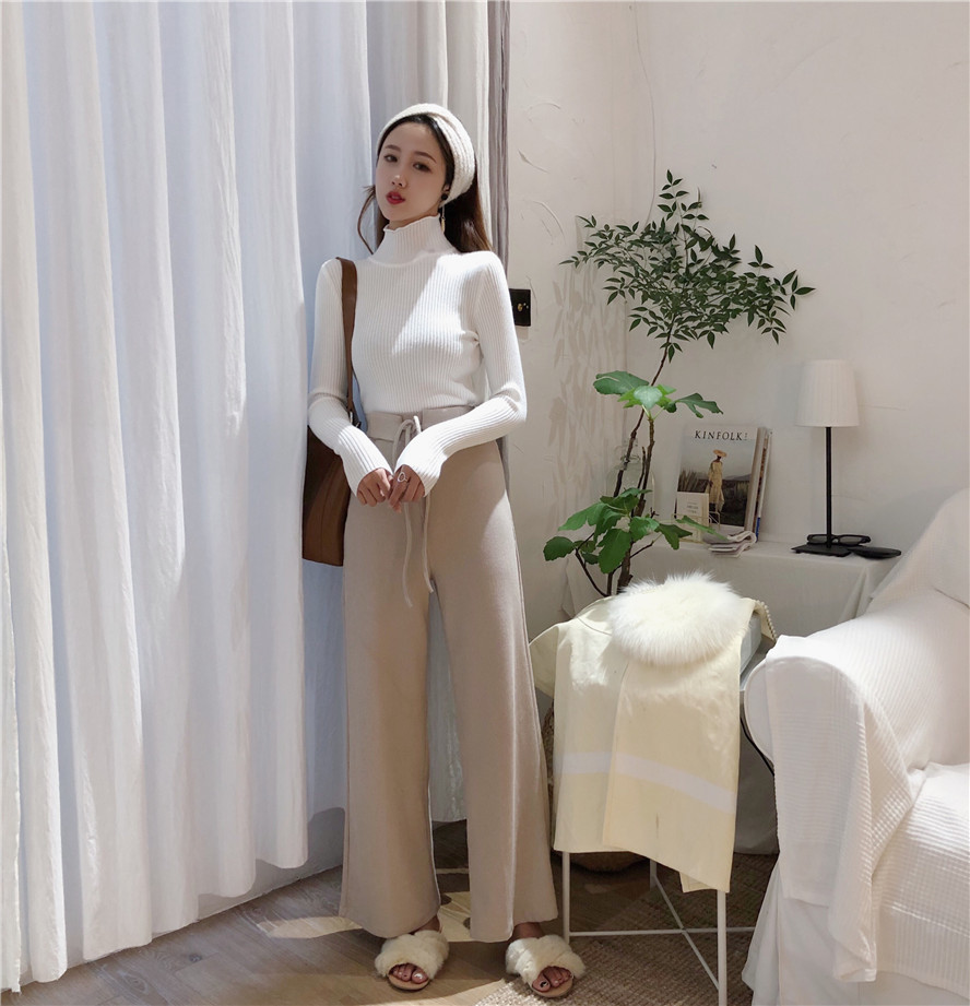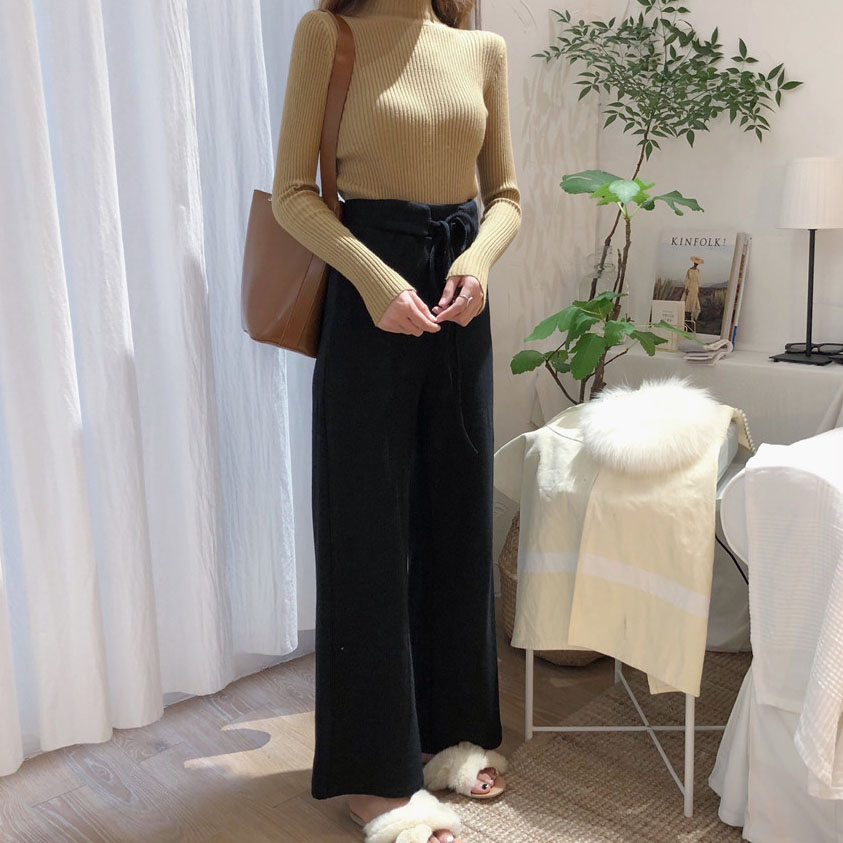 秋裝女2018新款系腰帶針織直筒長褲秋冬高腰顯瘦寬松休閑闊腿褲潮