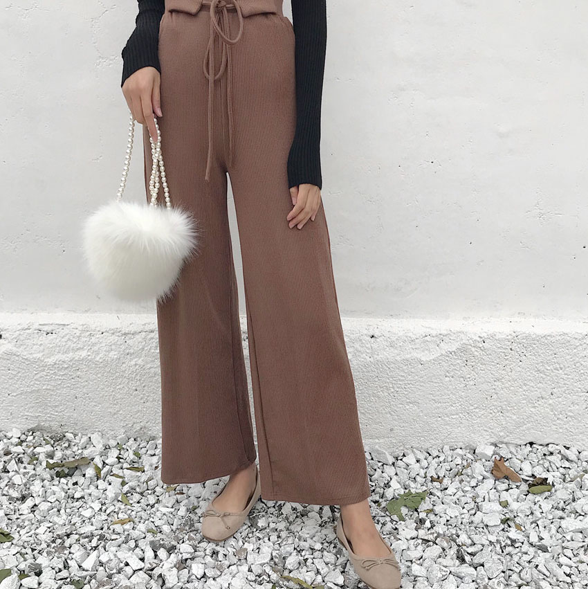 復古韓國chic風氣質溫柔純色坑條系帶高腰坑條闊腿針織褲直筒褲女