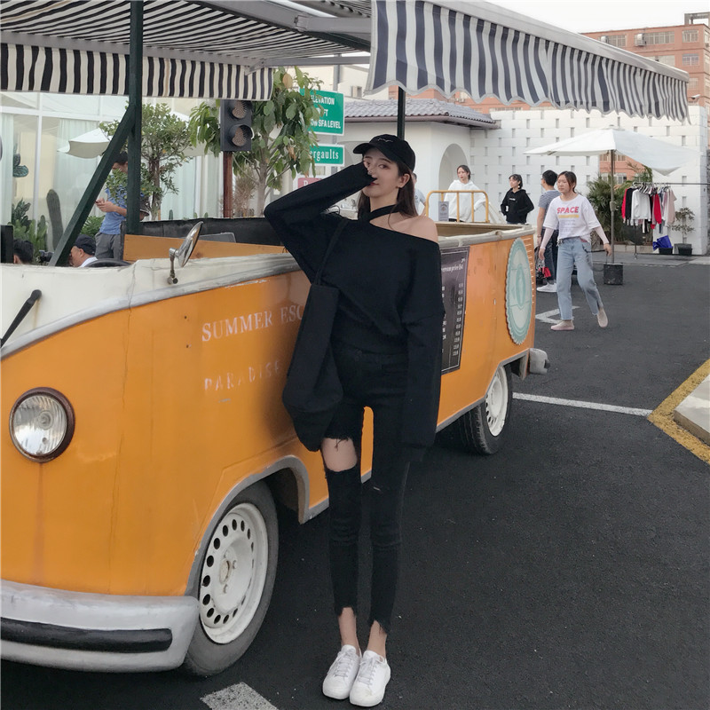 / 韓版簡約小心機斜露肩衛衣女+百搭高腰顯瘦割破牛仔小腳褲兩件套
