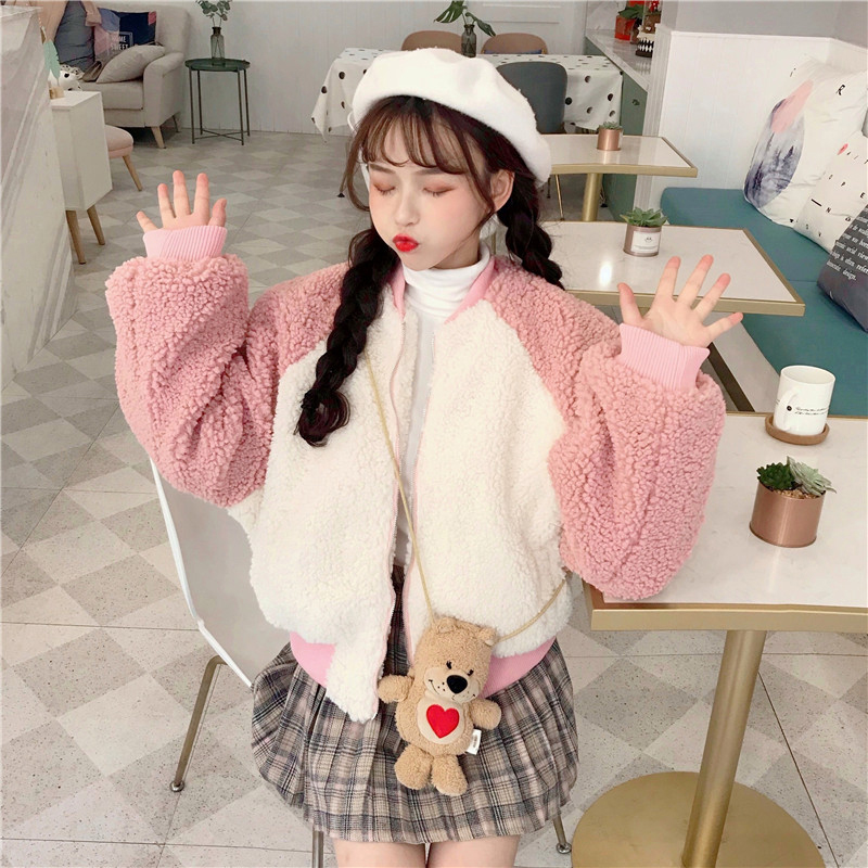 / 學院風撞色仿羊羔毛棒球服女秋冬裝2018新款韓版寬松長袖棉衣外套
