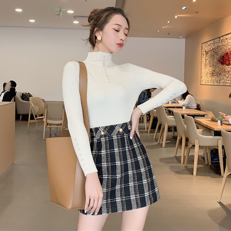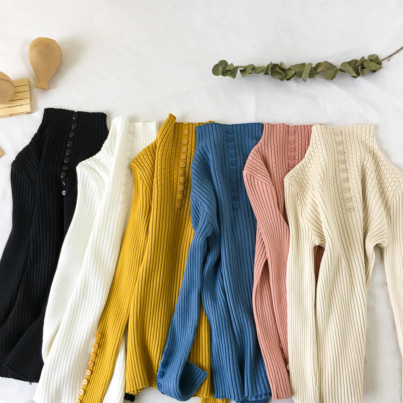 / chic氣質半高領袖口紐扣針織衫女冬裝2018新款修身顯瘦打底薄毛衣