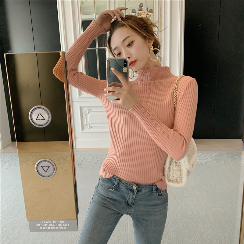 chic氣質半高領袖口紐扣針織衫女冬裝2018新款修身顯瘦打底薄毛衣