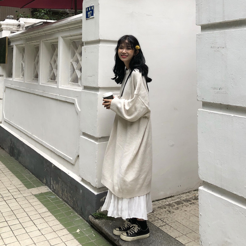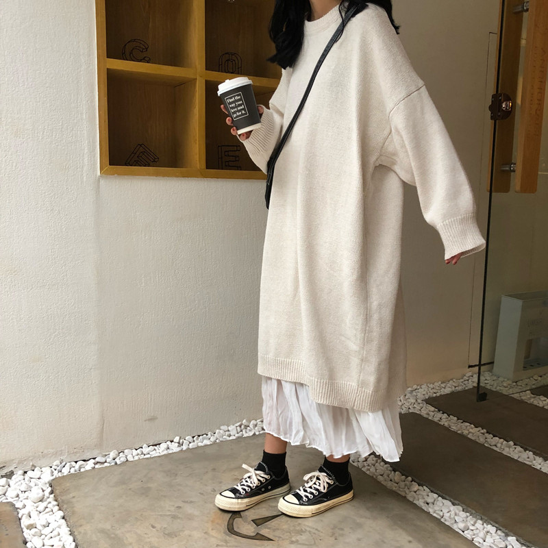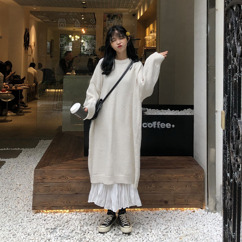 可可里小姐~長款過膝針織毛衣裙+褶皺雪紡半身裙 套裝