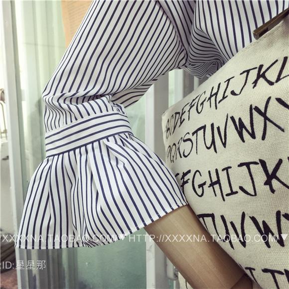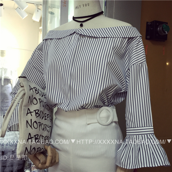 / 2017初秋新款韓版時尚百搭一字POLO肩氣質喇叭袖條紋襯衫女C111