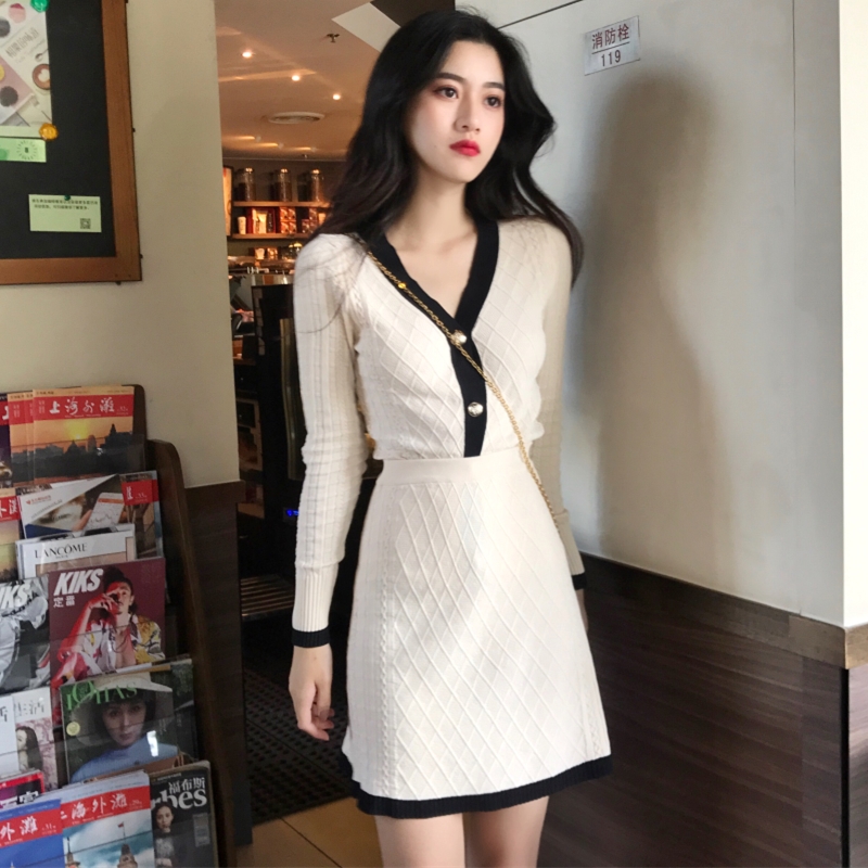 小香風新款秋季時尚兩件套V領排扣勾花開衫短裙針織氣質復古套裝