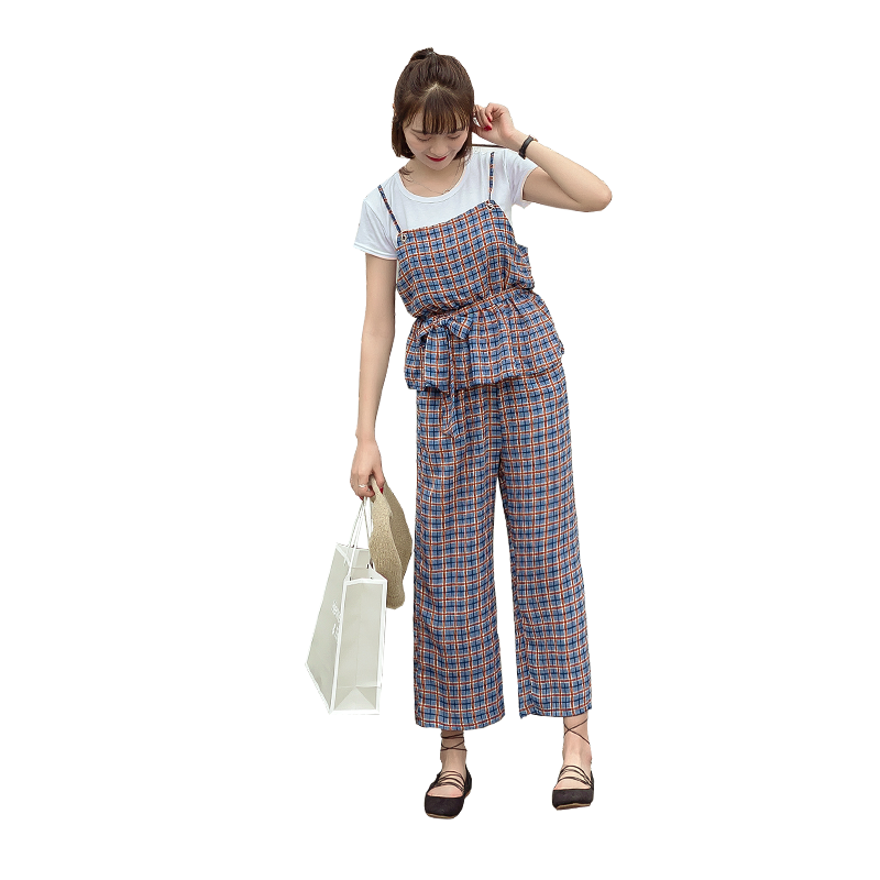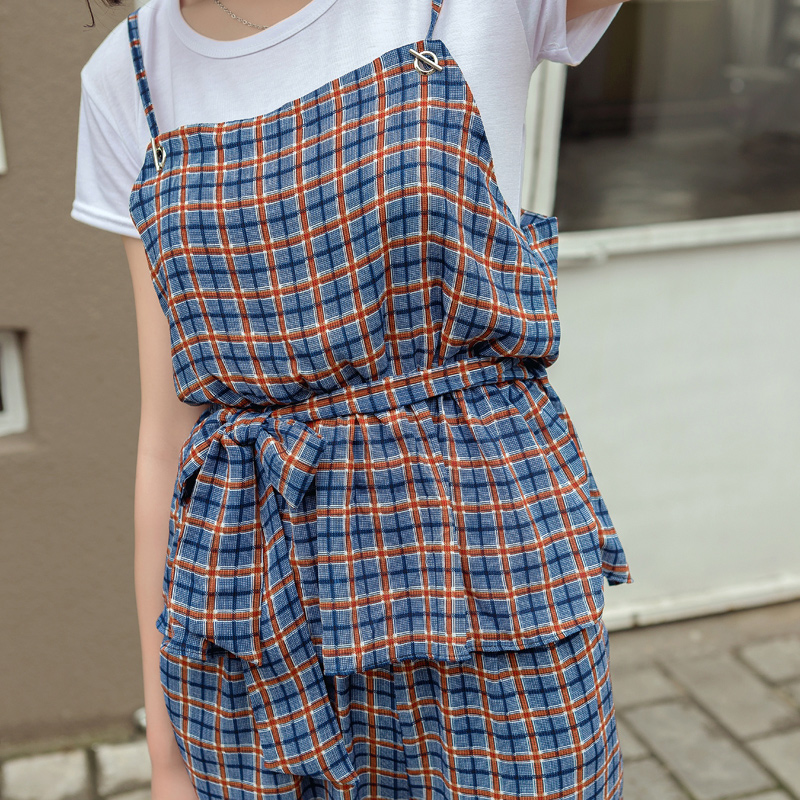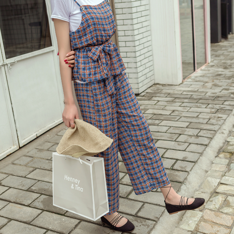 腰部做了松緊綁帶的設計 下身是格子的闊腿褲,松緊腰部,