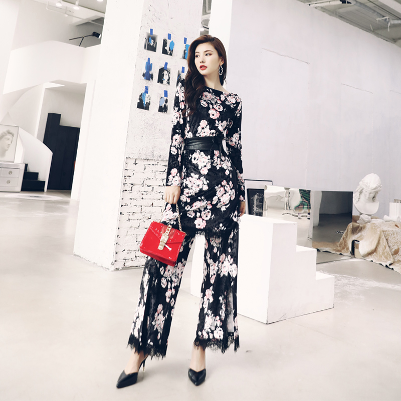 絲絨套裝女收腰上衣印花開叉蕾絲拼接長褲名媛氣質時尚初秋兩件套
