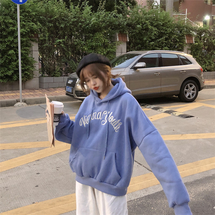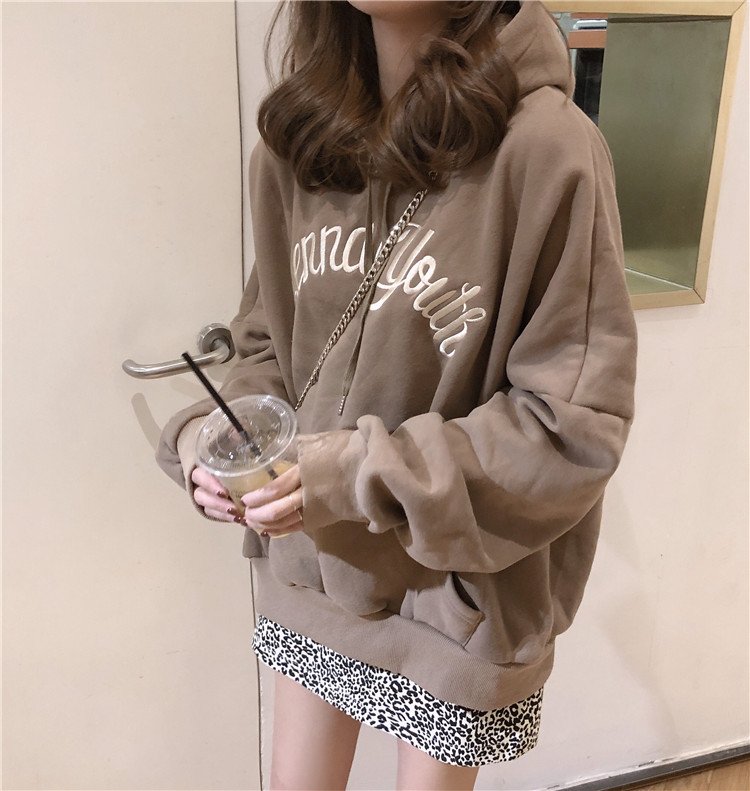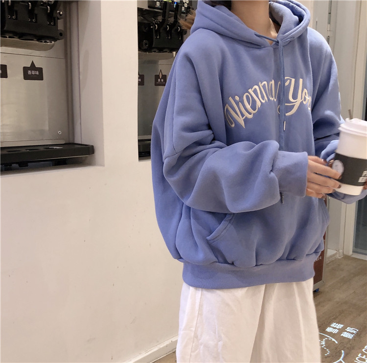 2018新款秋冬韓版慵懶風寬松字母刺繡連帽加絨加厚衛衣上衣外套女
