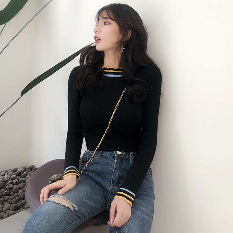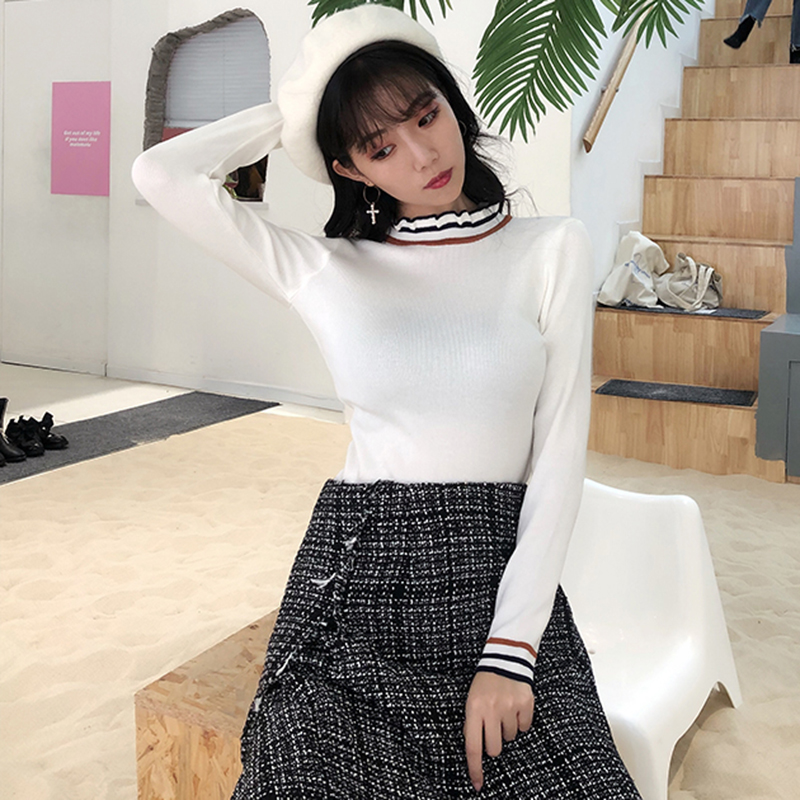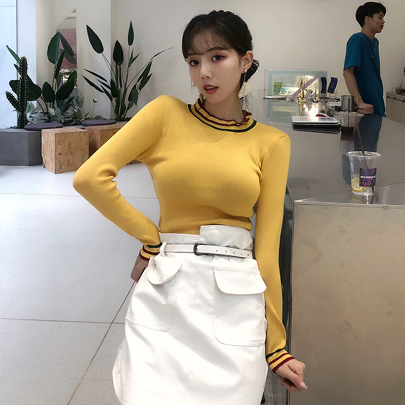 秋冬女裝2018新款韓版半高領木耳邊針織衫修身顯瘦外穿打底薄毛衣