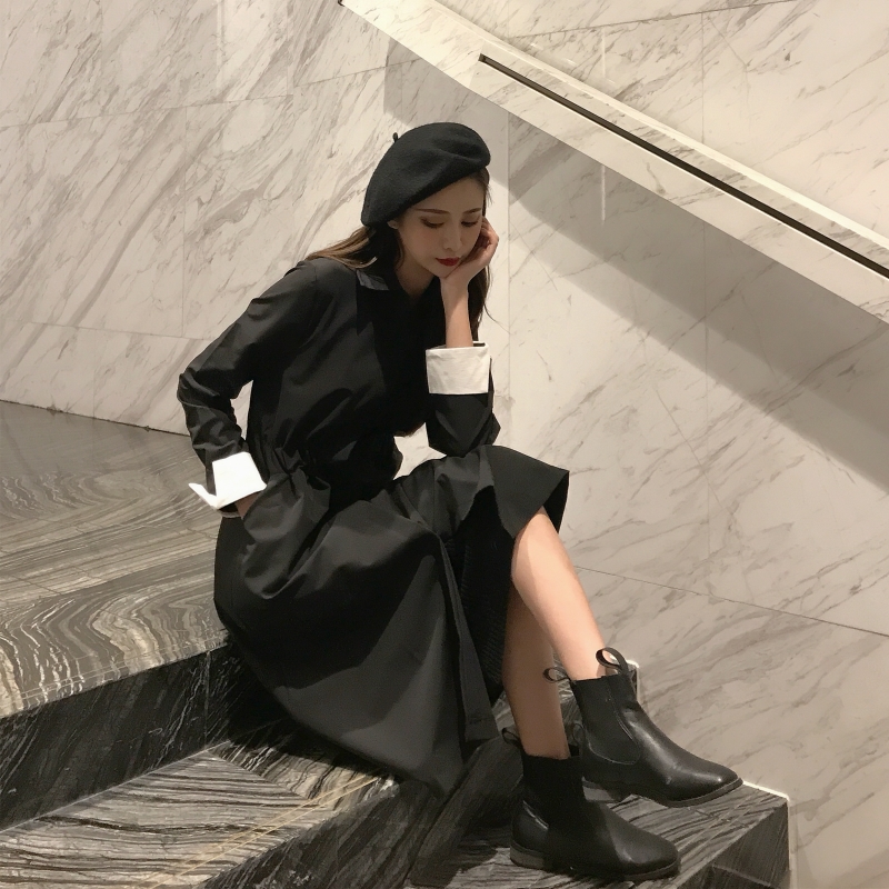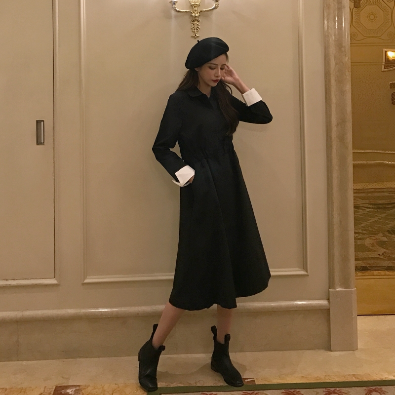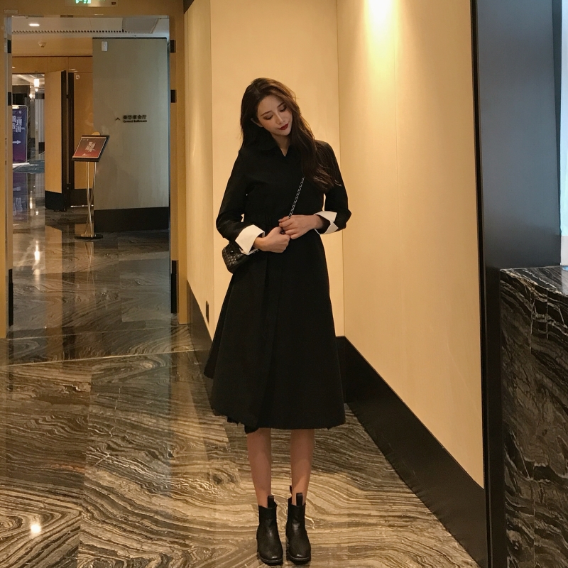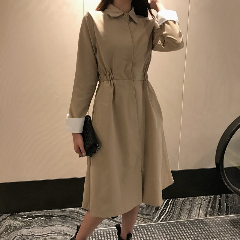 2018港風時尚chic秋季新款小香風連衣裙袖口撞色翻邊設計風衣裙女