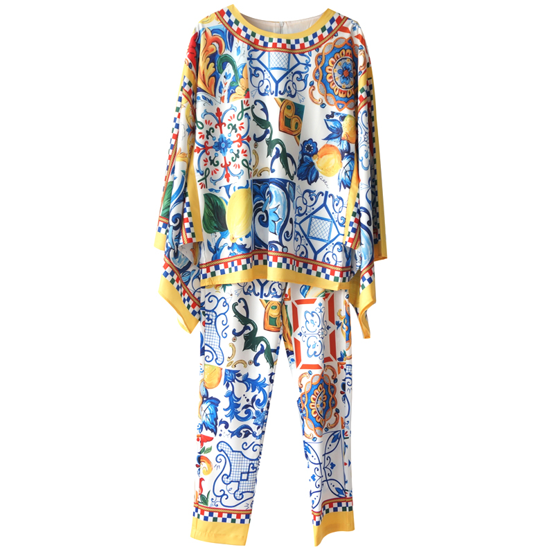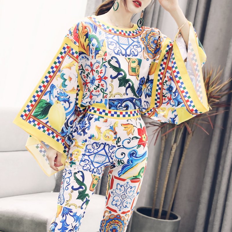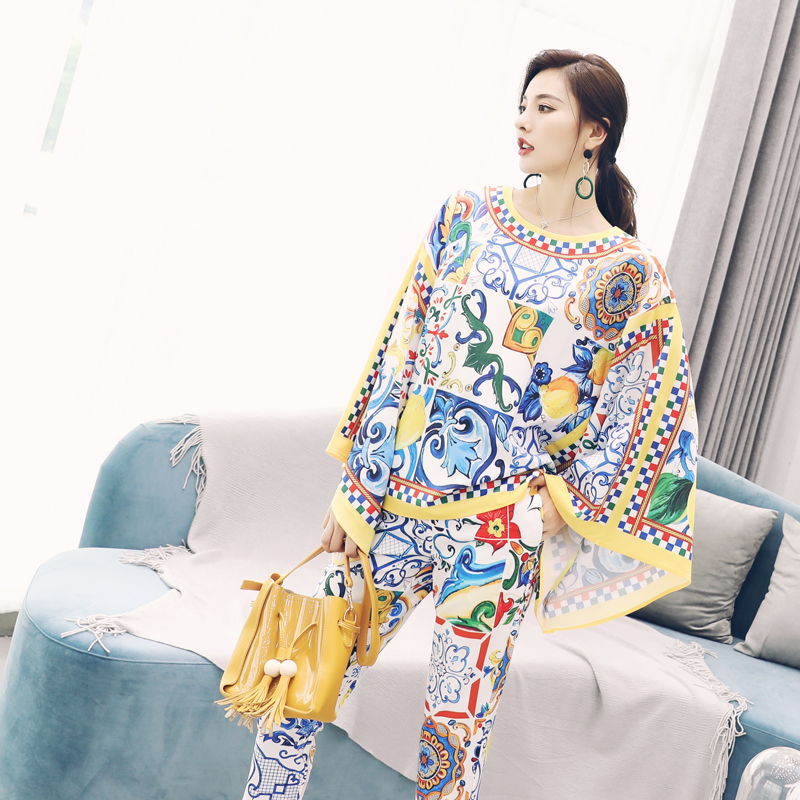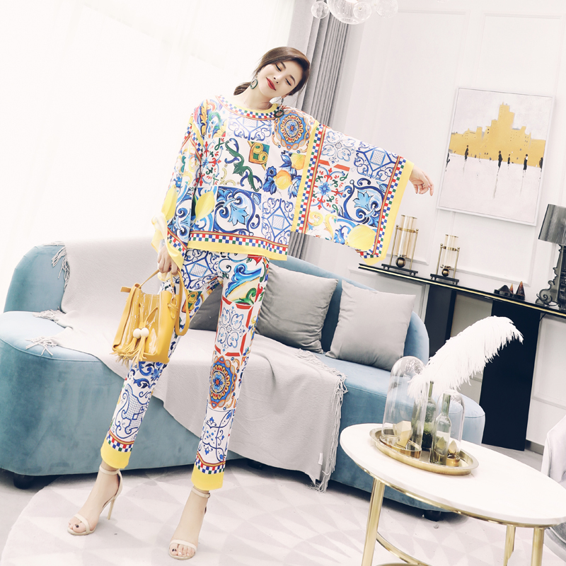 / 歐洲站2018夏季新款寬松蝙蝠袖上衣小腳褲印花兩件套洋氣套裝歐貨
