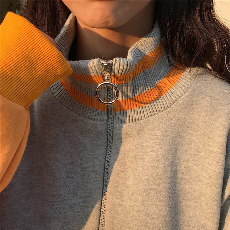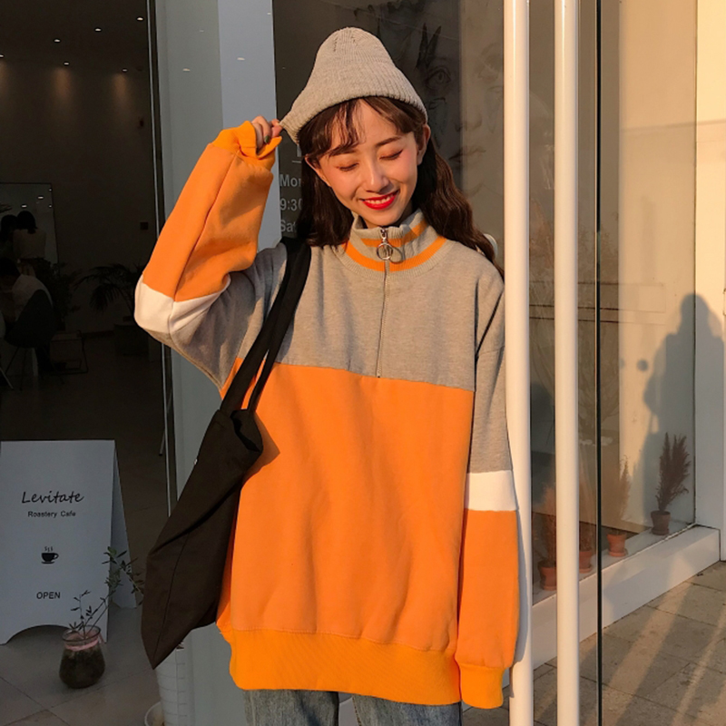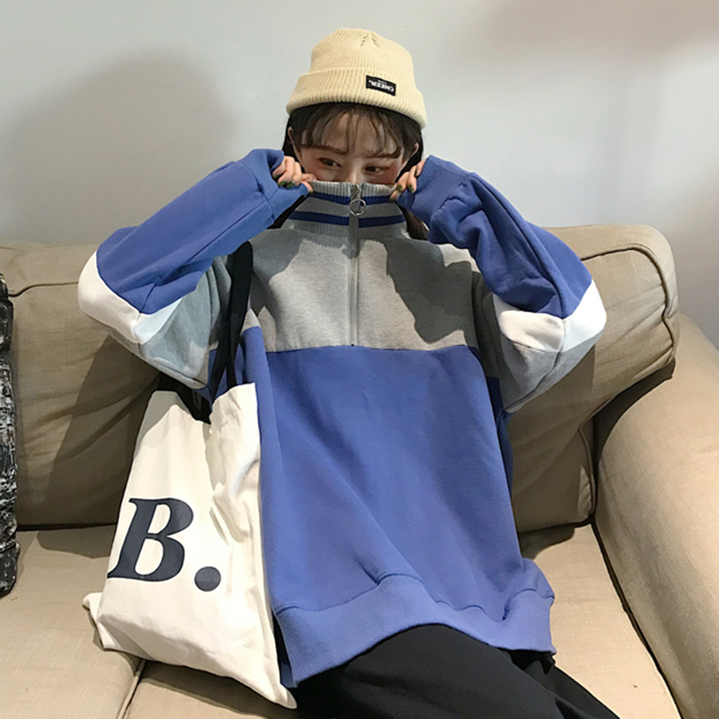 冬季新款女裝韓版拼色高領超火衛衣外套寬松加絨加厚學生長袖上衣