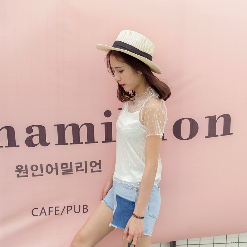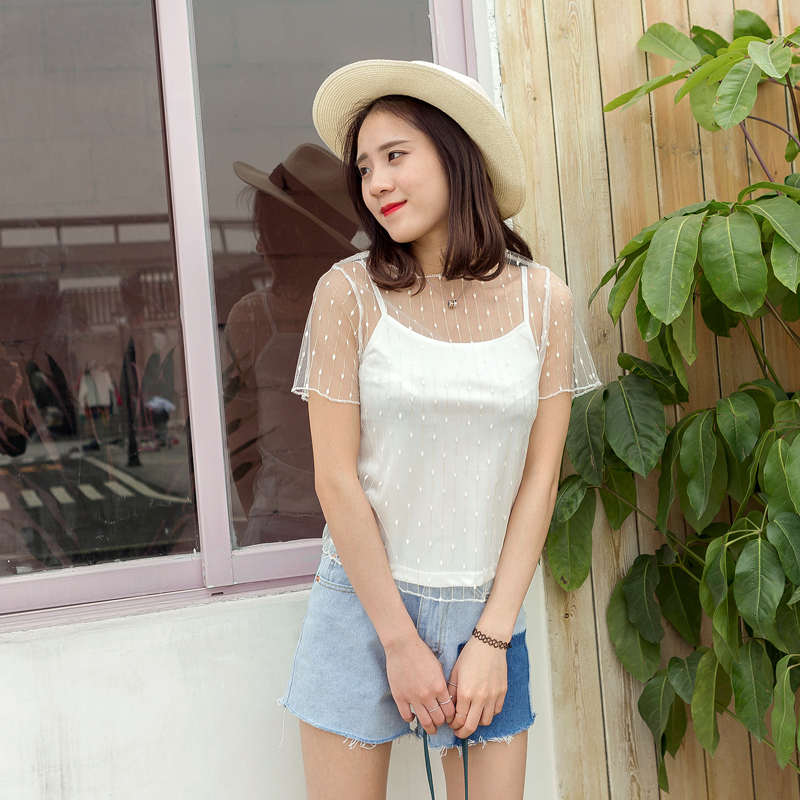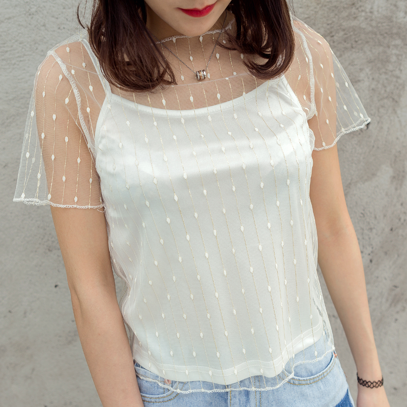 / 夏裝新款韓版女裝百搭蕾絲衫上衣白色短袖鏤空罩衫吊帶兩件套