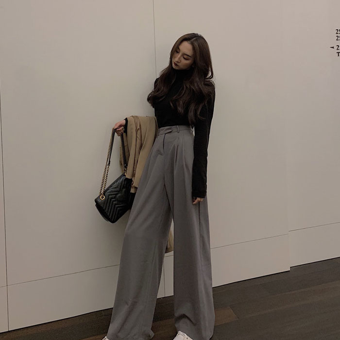 港味復古chic風早秋百搭高腰絲絨闊腿褲氣質寬松顯瘦休閑長褲女潮