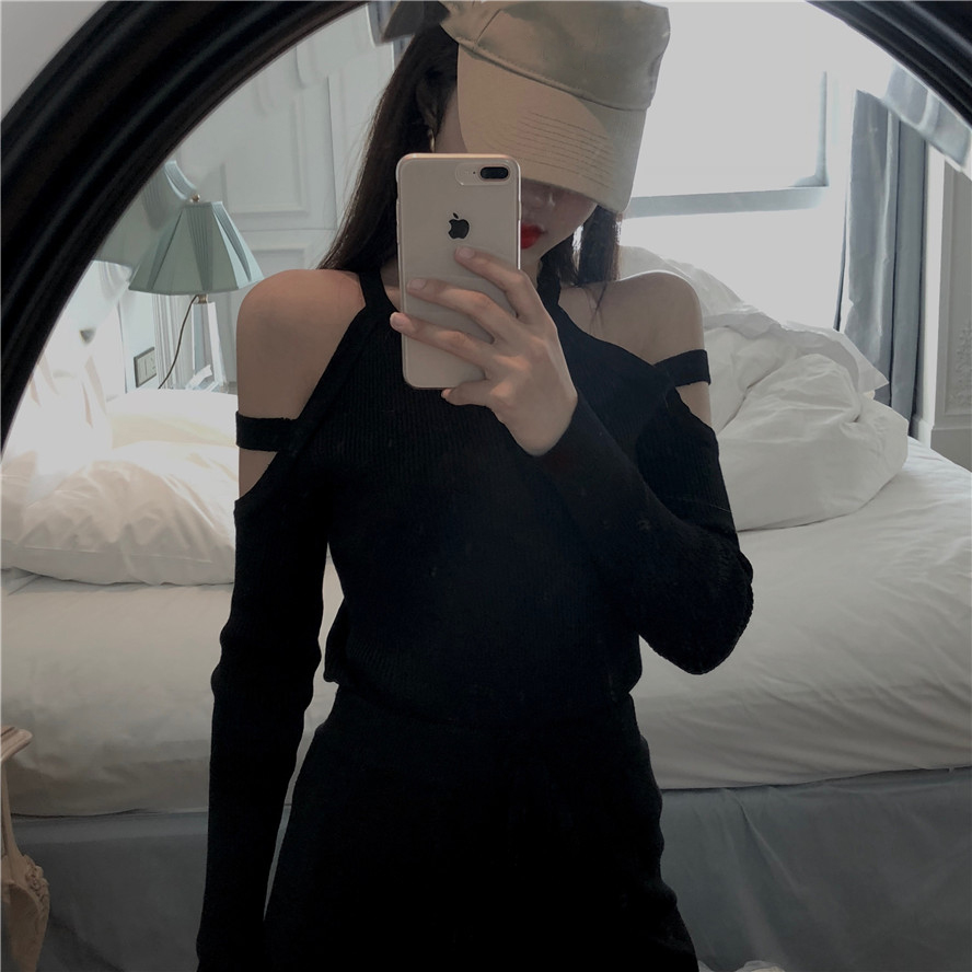 / 秋冬新款網紅同款性感氣質修身顯瘦小心機鏤空露肩長袖針織衫女潮