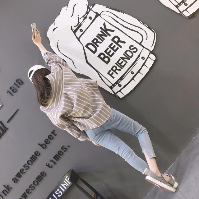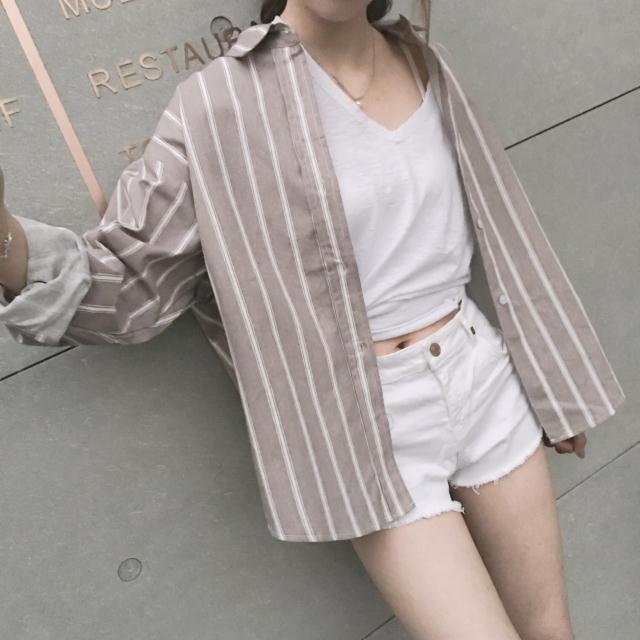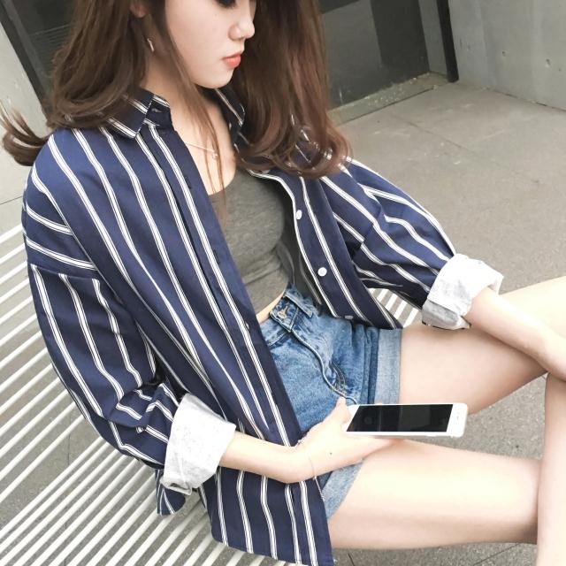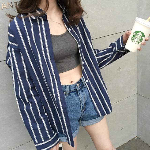 / 中長款韓版簡約百搭寬松豎條紋BF風大碼長袖襯衫女韓范2017春秋