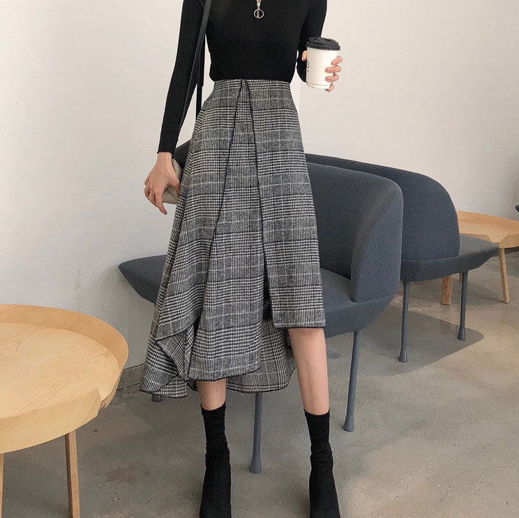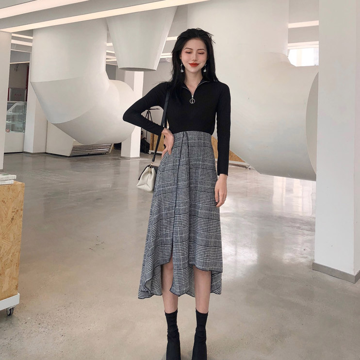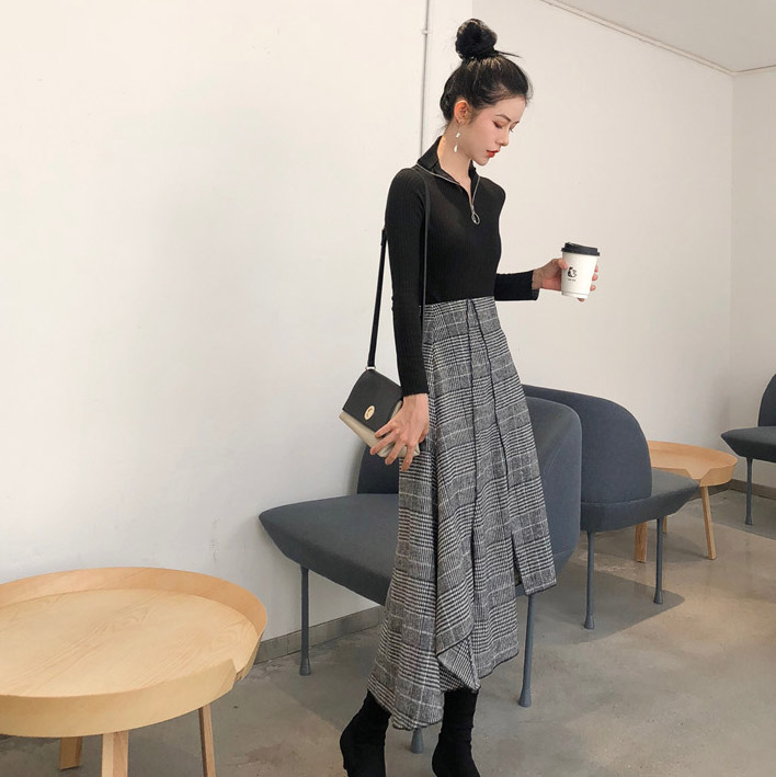 / 秋裝女2018新款套裝半高領套頭拉鏈打底衫+格子不規則開叉半身裙