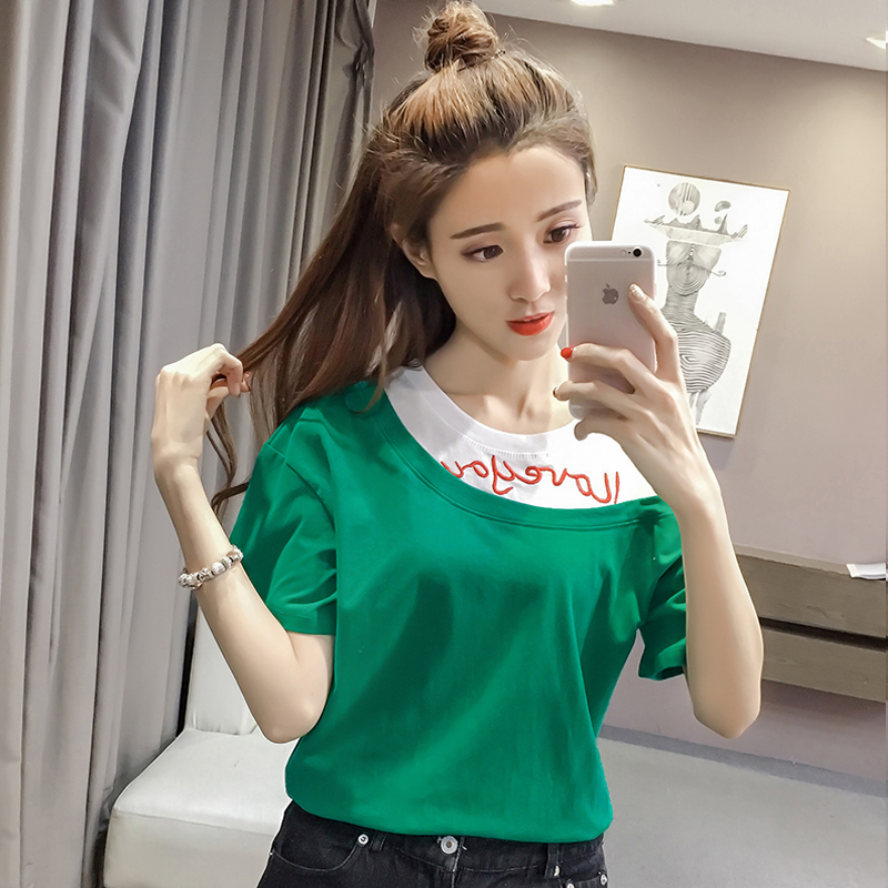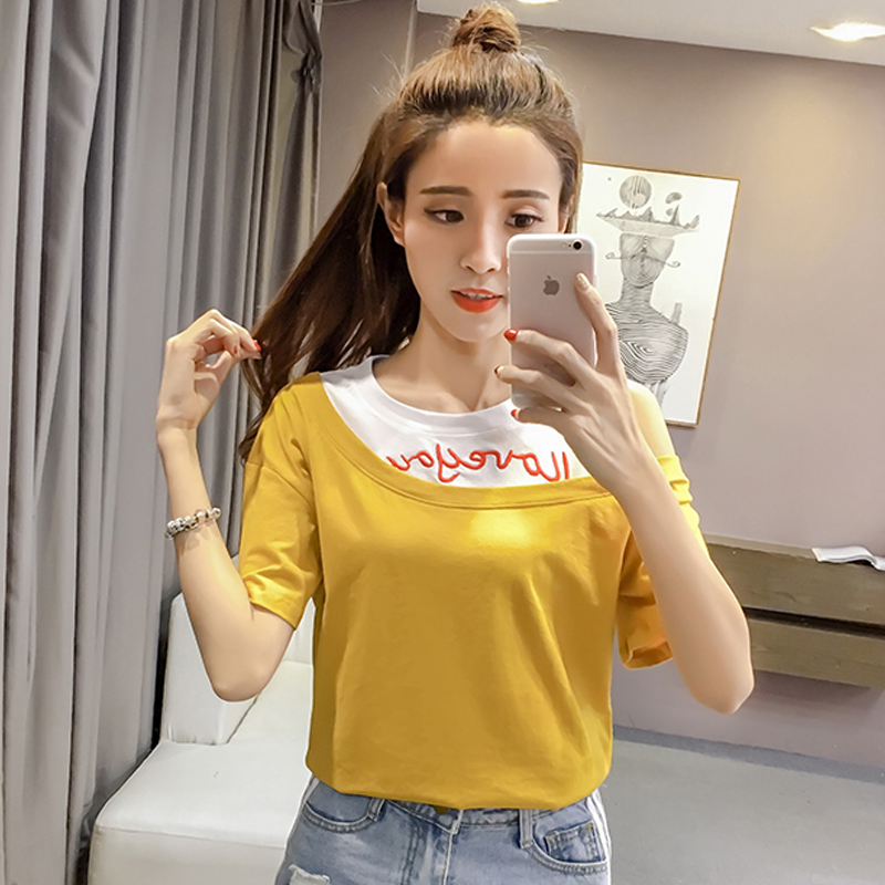 夏裝新款韓版刺繡露肩假兩件上衣短袖寬松白色t恤女學生半袖體恤