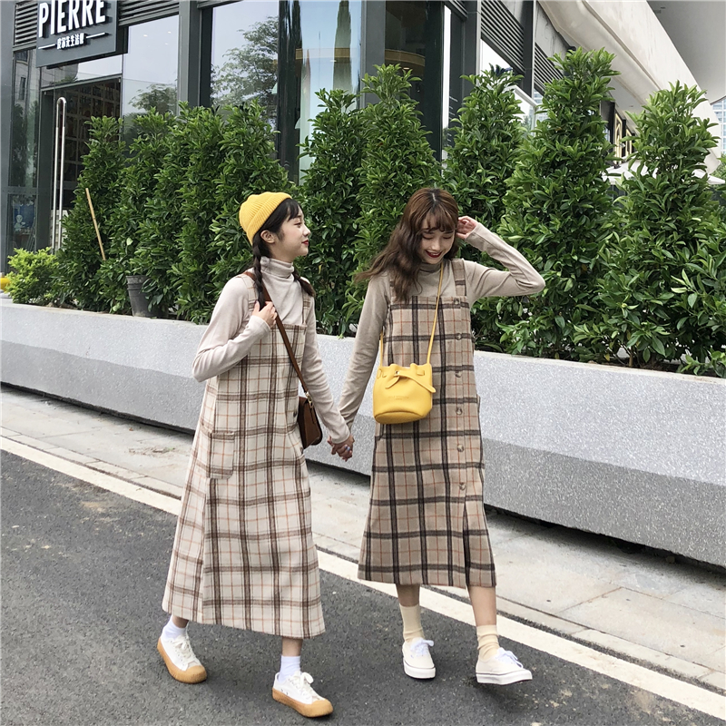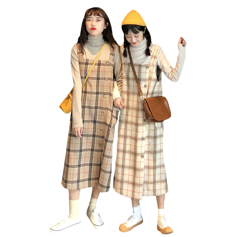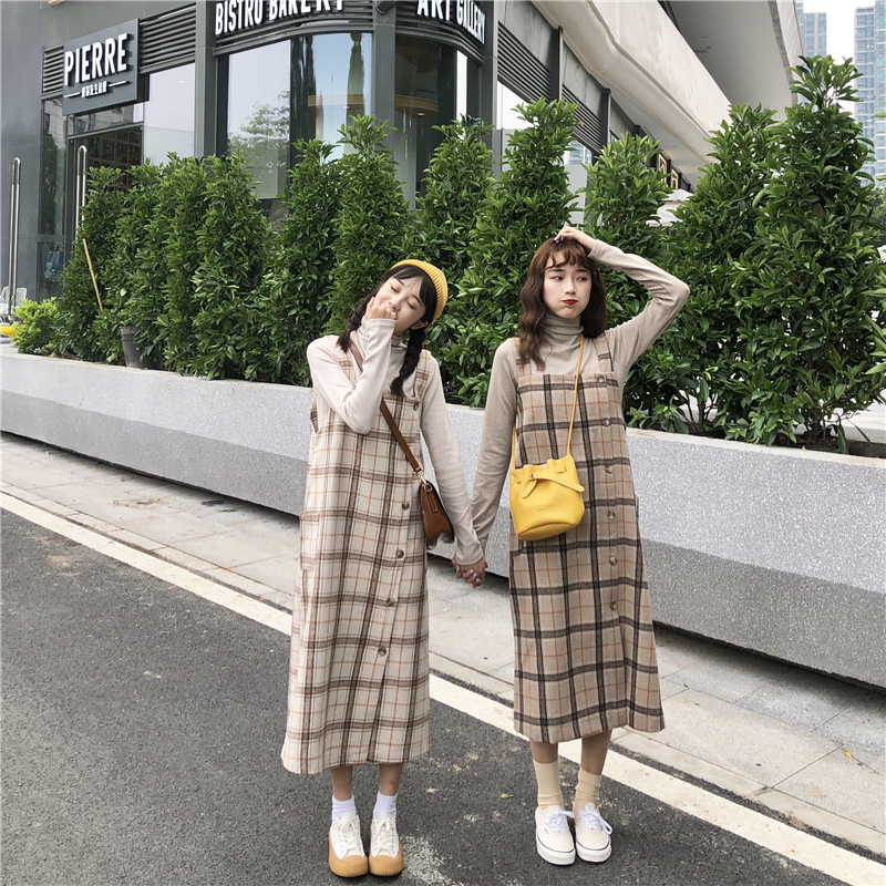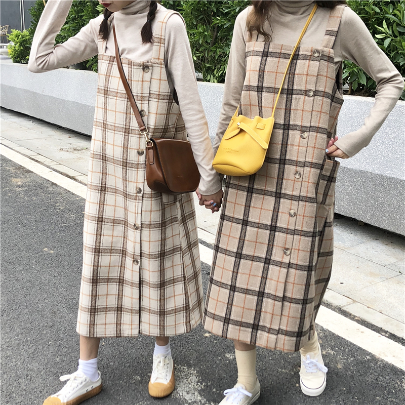 / 秋冬韓版中長款氣質復古格子寬松背帶裙連衣裙長裙+針織打底T恤女