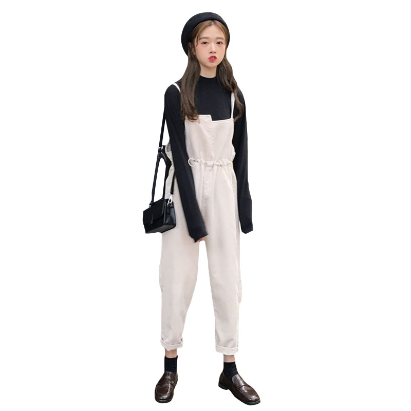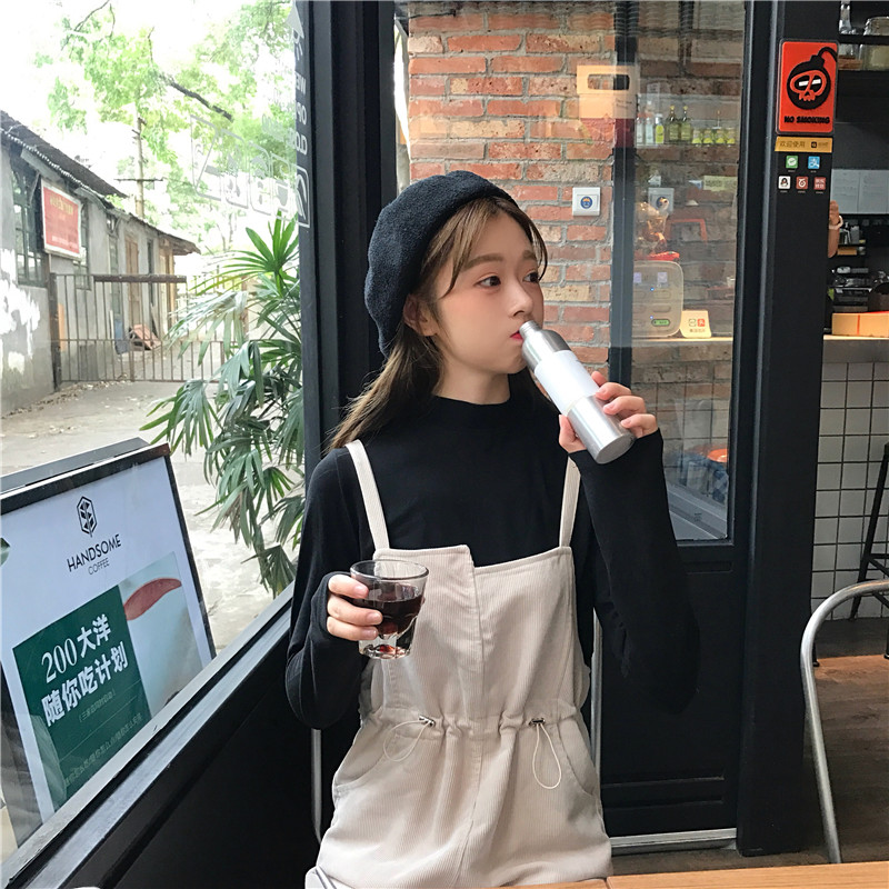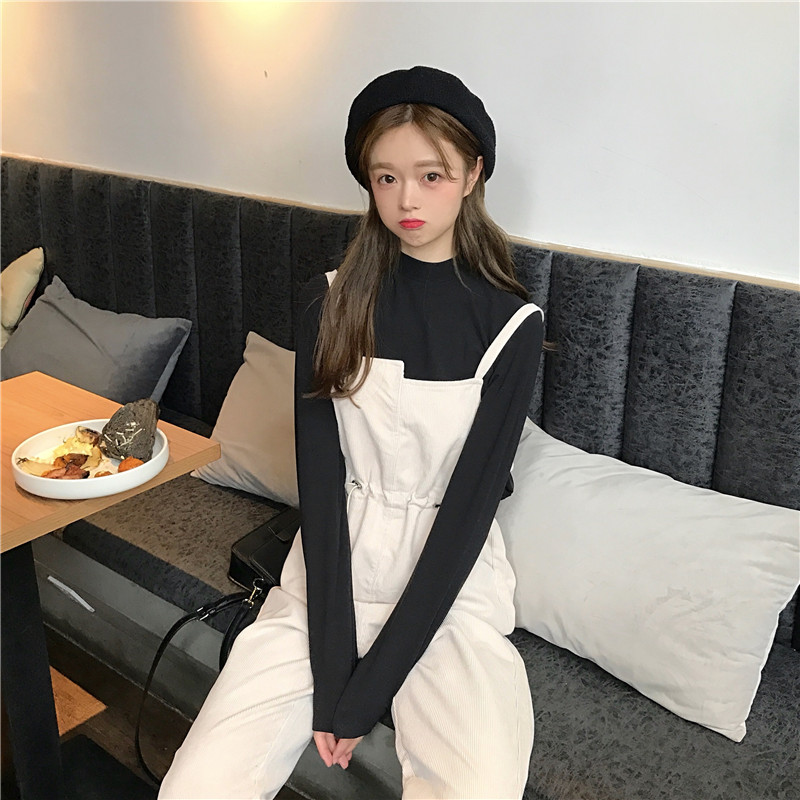 / 韓版時尚休閑套裝秋季女裝純色打底衫T恤+燈芯絨收腰背帶褲兩件套