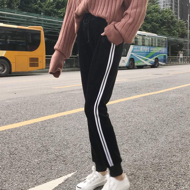 秋裝女2018新款側邊條紋束腳哈倫褲高腰絲絨保暖休閑運動長褲子潮