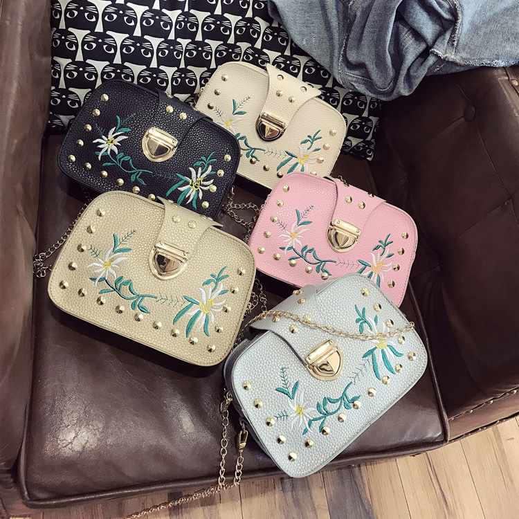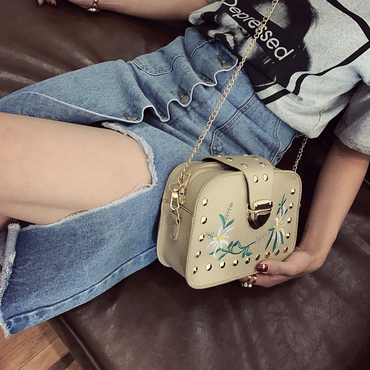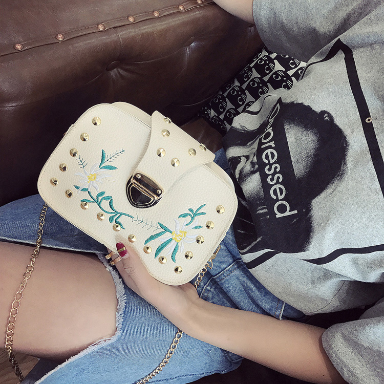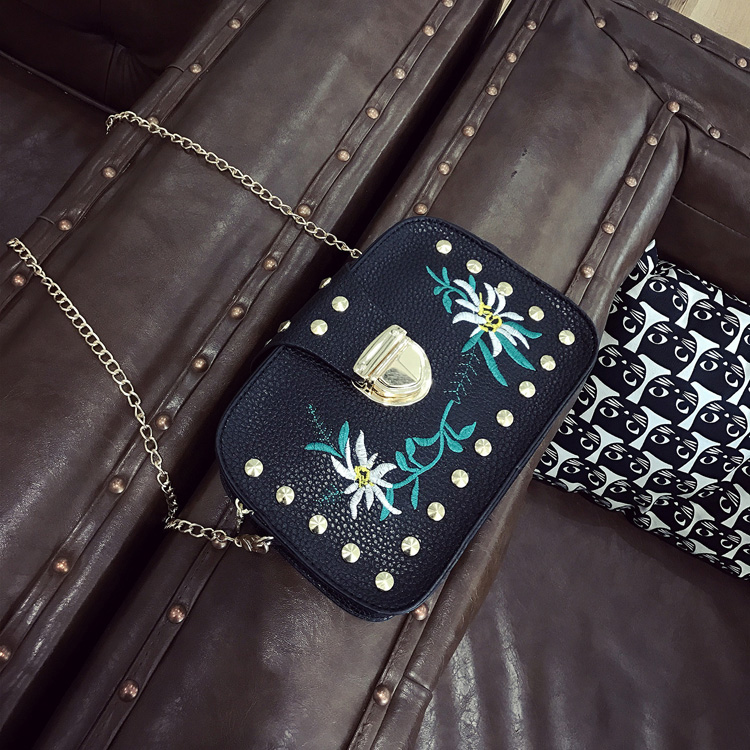 17新款女包刺繡小方包百搭鉚釘小包包韓版潮迷你鏈條單肩斜挎包
