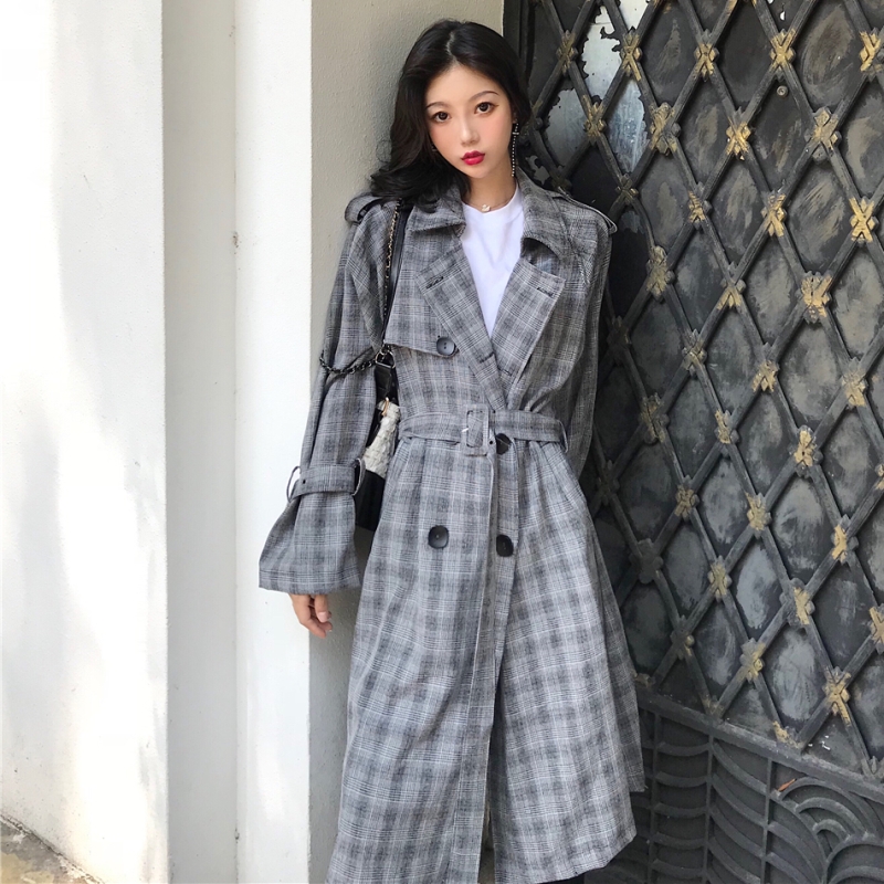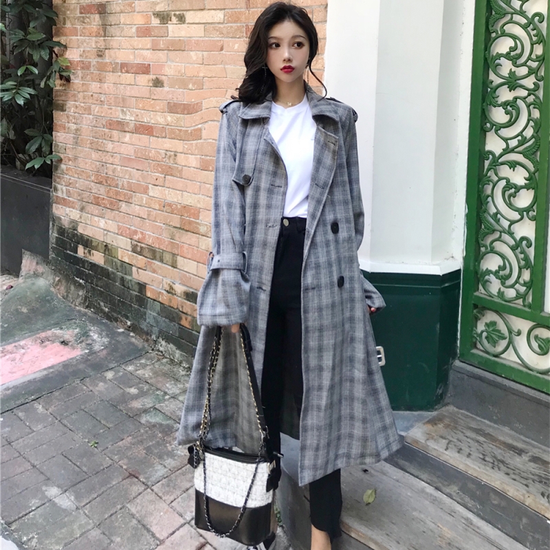 2018赫本秋冬新款收腰顯瘦翻領格子女雙排扣中長款過膝毛呢外套女
