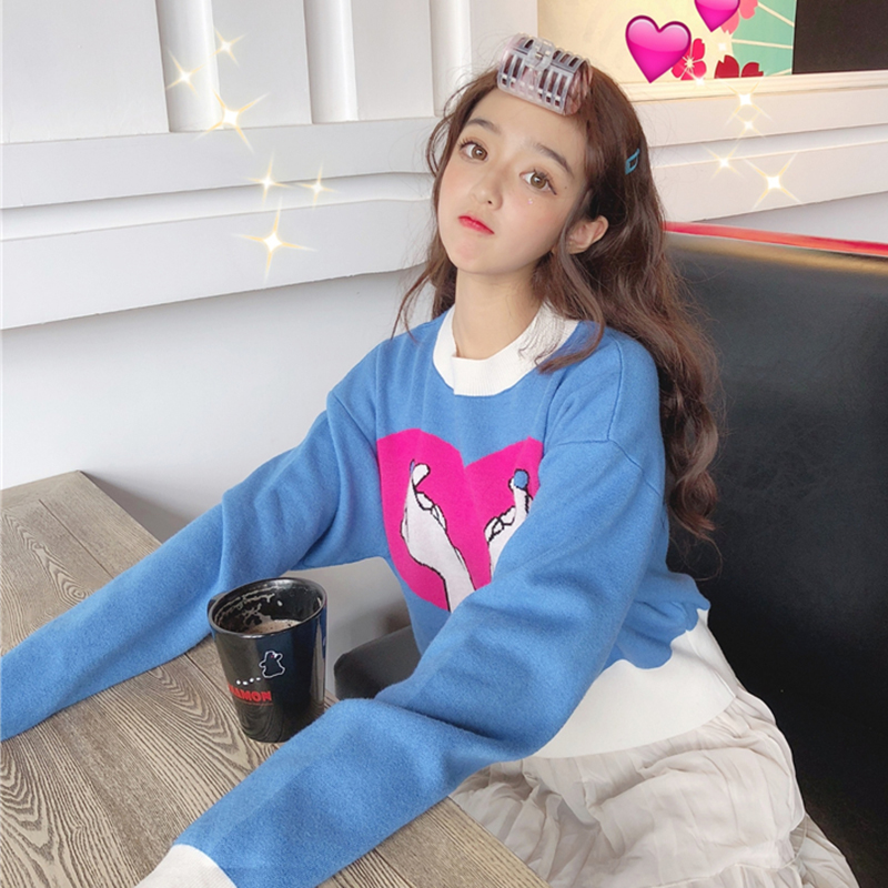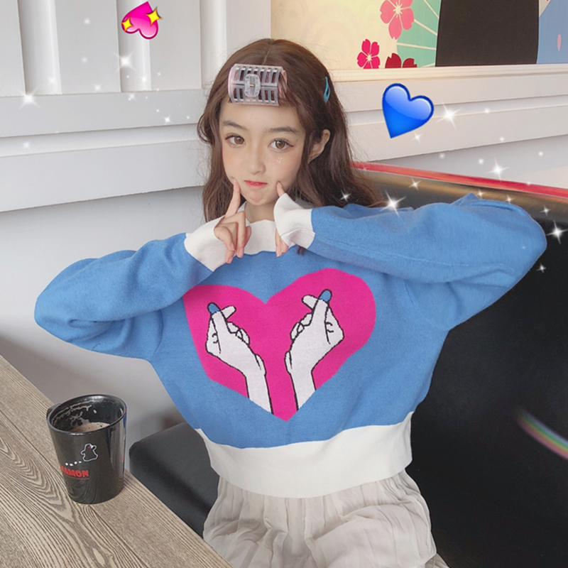 / 怪味少女愛心撞色套頭加絨衛衣秋冬裝2018新款韓版百搭寬松短外套