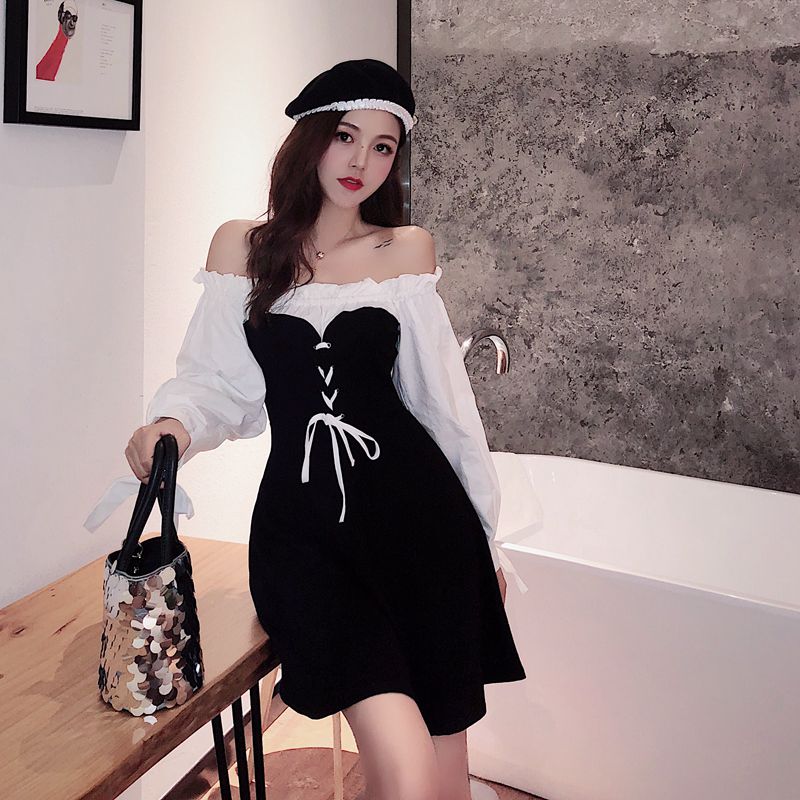 / 假兩件洋氣小衫女氣質木耳邊拉肩蝴蝶結泡泡袖前面抽繩系帶連衣裙