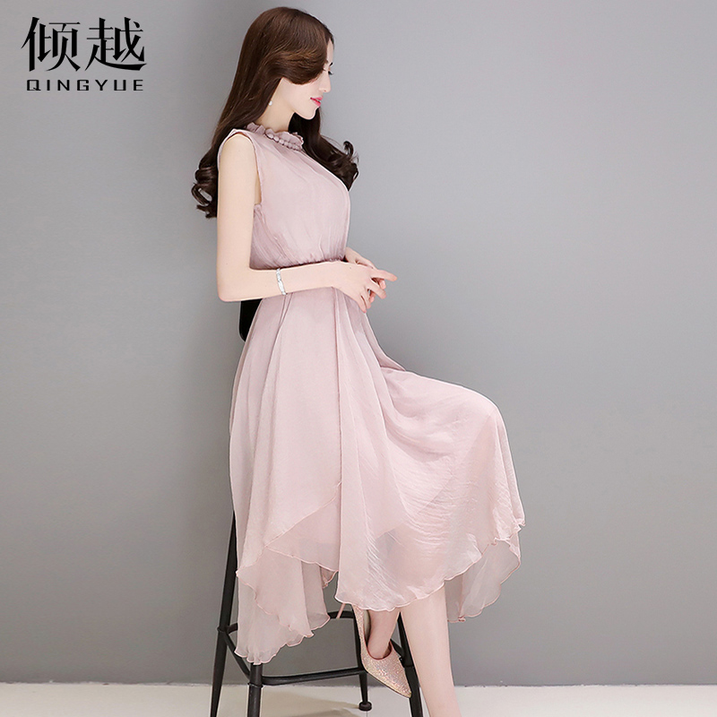 雪紡連衣裙女夏長裙無袖2017新韓版氣質小清新沙灘裙仙女裙中長款