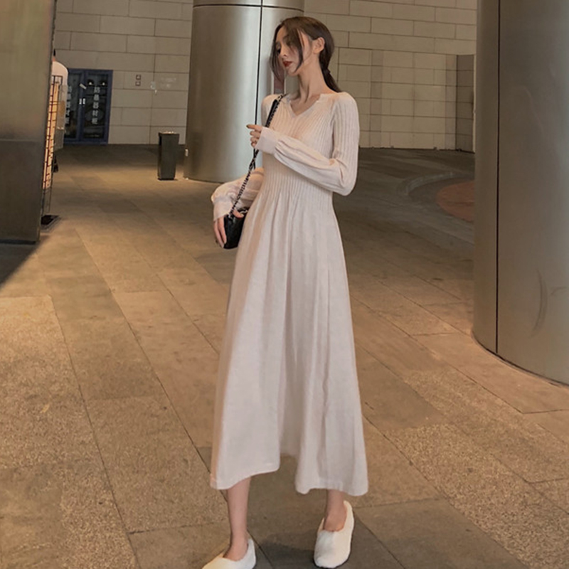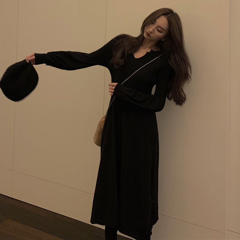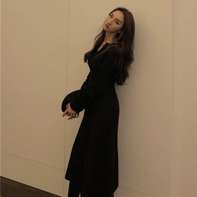 / 秋冬裝2018新款高腰顯瘦氣質針織連衣裙法式少女egg風V領小黑裙子