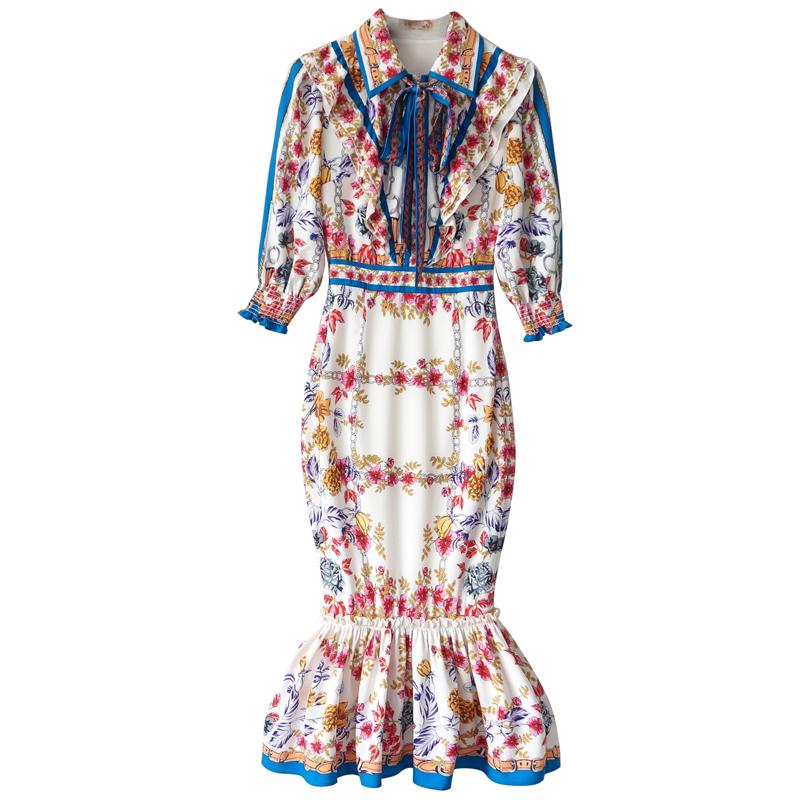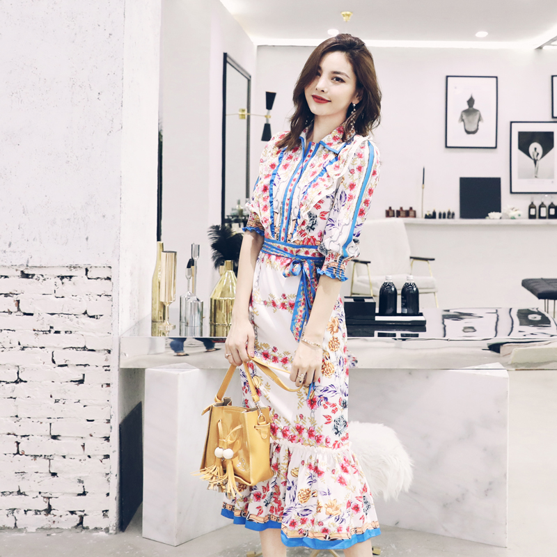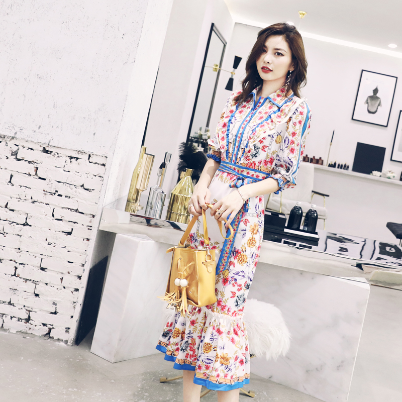 S秀2018夏季新款印花拼接連衣裙復古修身氣質中長款一步裙花瓣袖