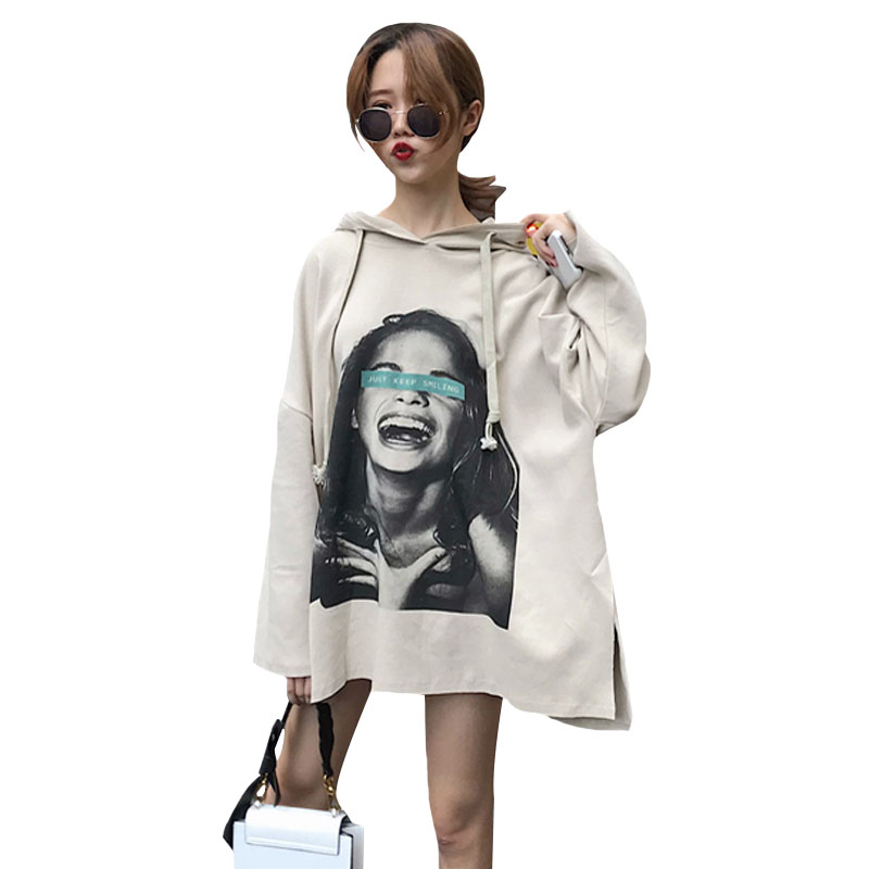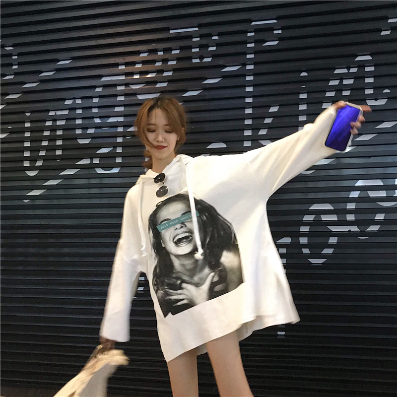 秋季女裝2018新款韓版中長款原宿風寬松復古人物連帽超火衛衣外套