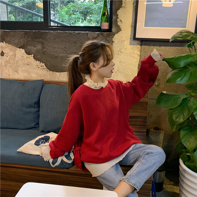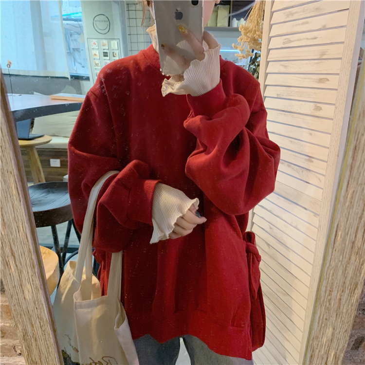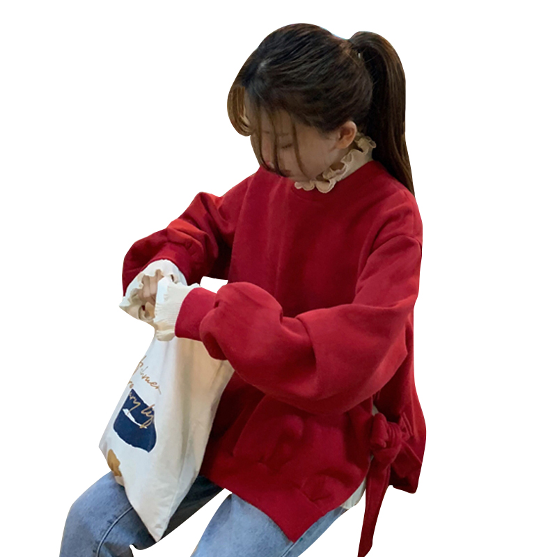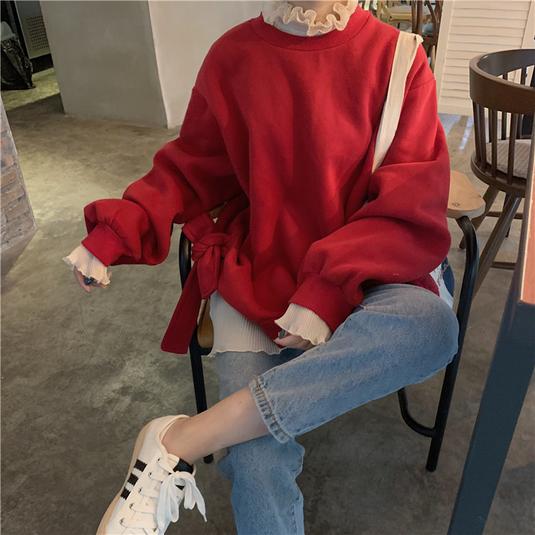 秋冬韓版慵懶風寬松加絨加厚側綁帶衛衣上衣外套+小高領打底衫女