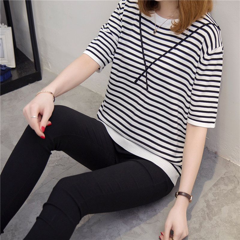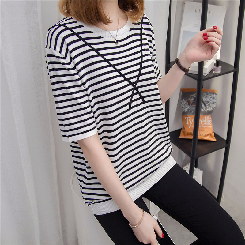 / 條紋針織衫女上衣寬松套頭薄款短袖針織打底衫春季女裝新款潮