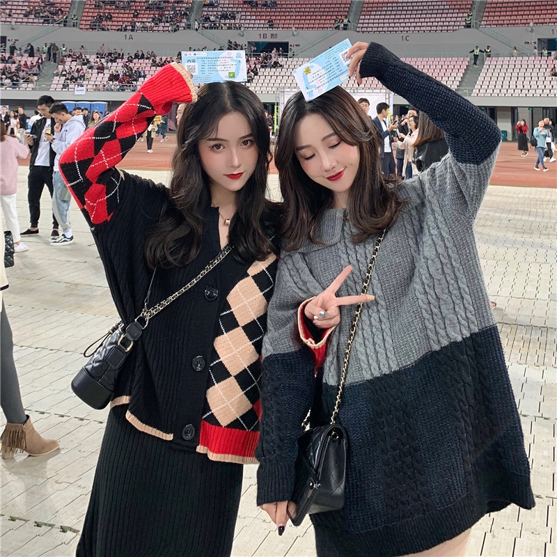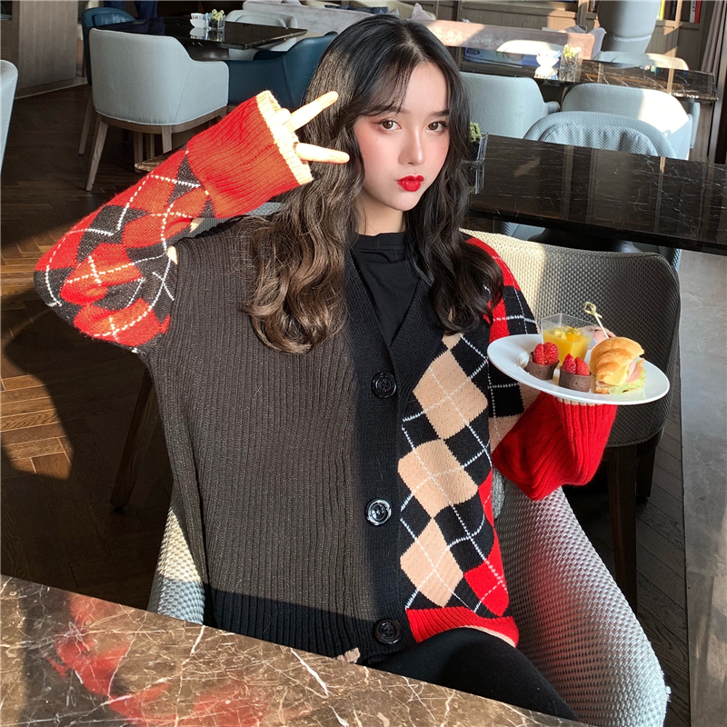/ 秋冬季新款chic百搭長袖格子慵懶風網紅毛衣針織外套女寬松開衫潮
