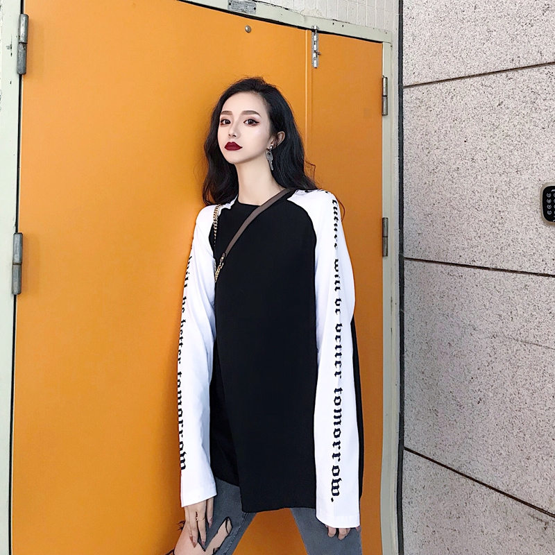 秋裝新款韓版上衣撞色字母印花插肩袖寬松中長款外穿打底長袖T恤