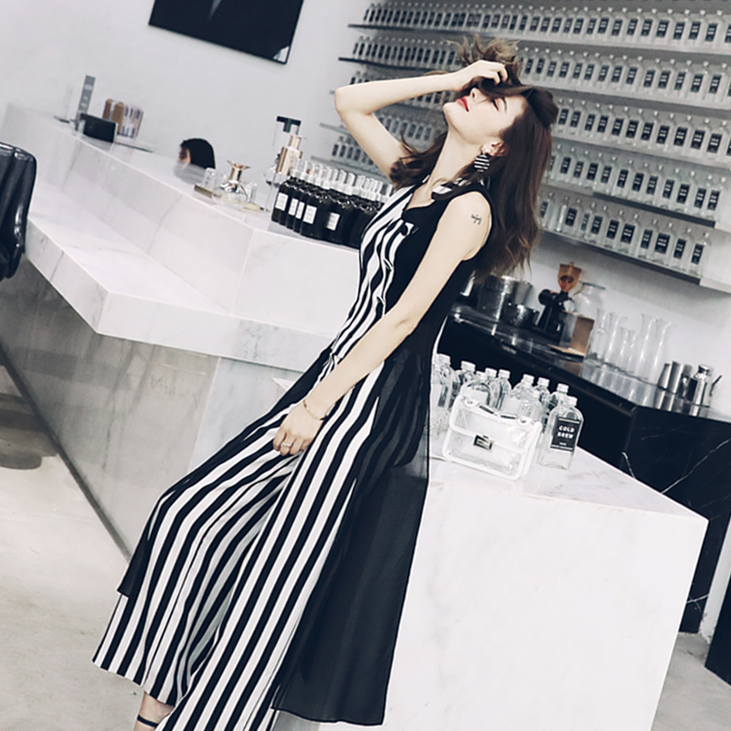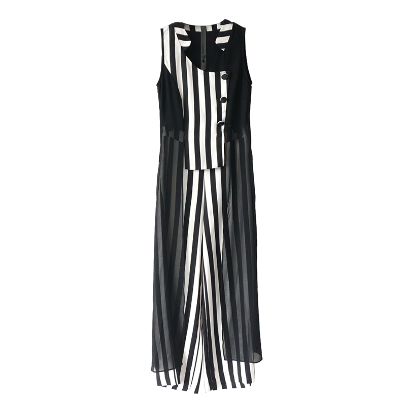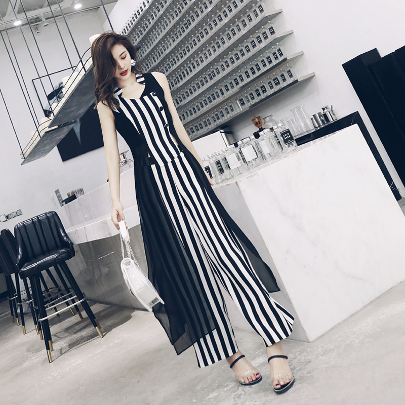 S秀名媛無袖不規則上衣條紋高腰闊腿褲網紅兩件套裝女夏2018新款
