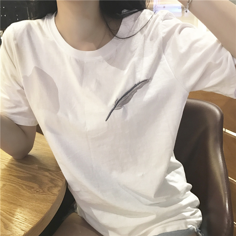 夏裝2018新款女羽毛刺繡百搭圓領顯瘦上衣氣質小寬松短袖套頭T恤