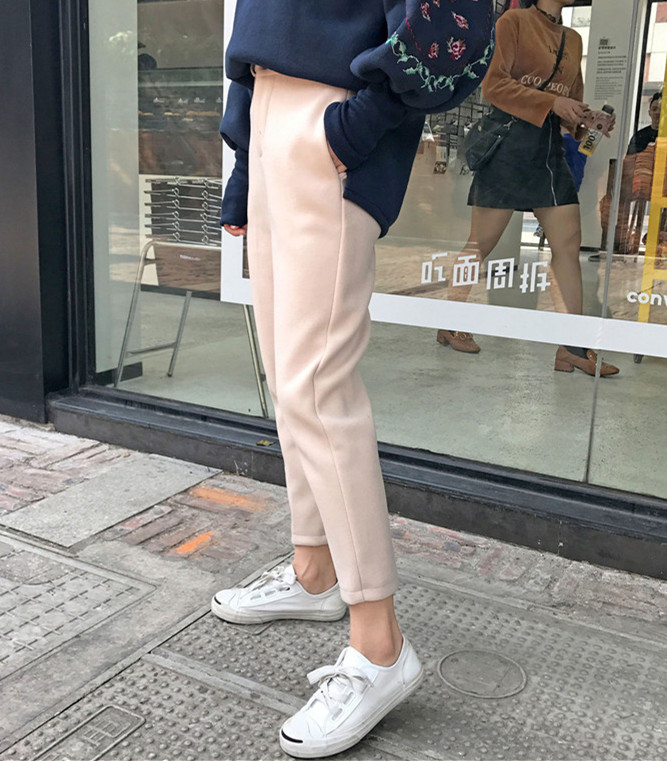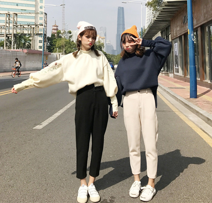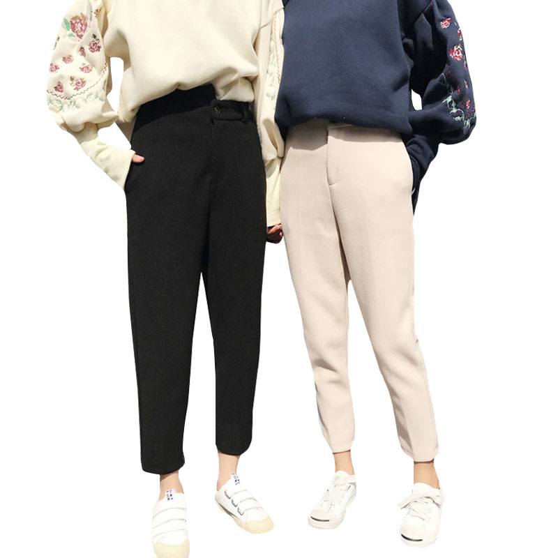 / 秋冬韓版寬松不對稱高腰休閑褲學生加厚毛呢直筒褲九分褲闊腿褲女