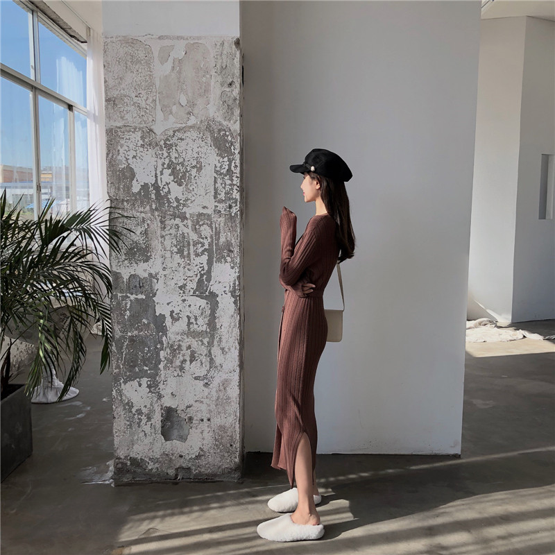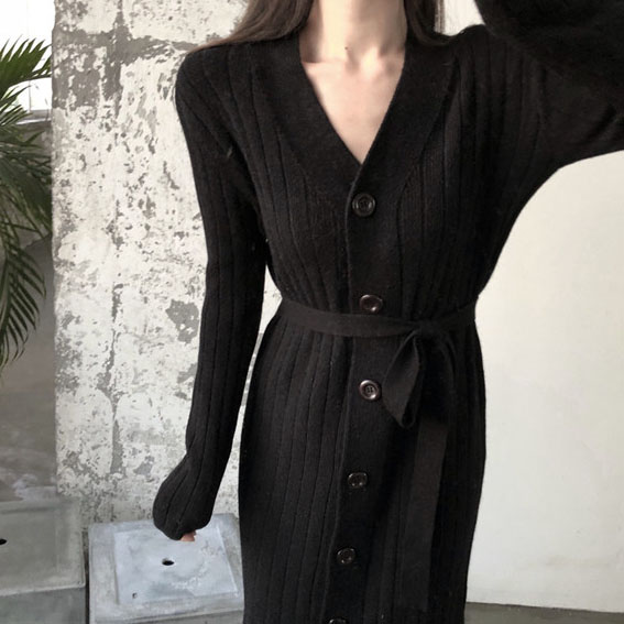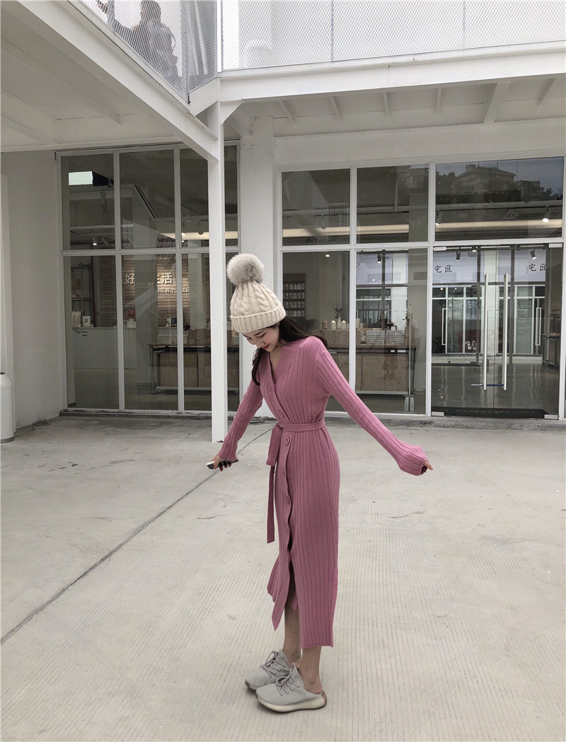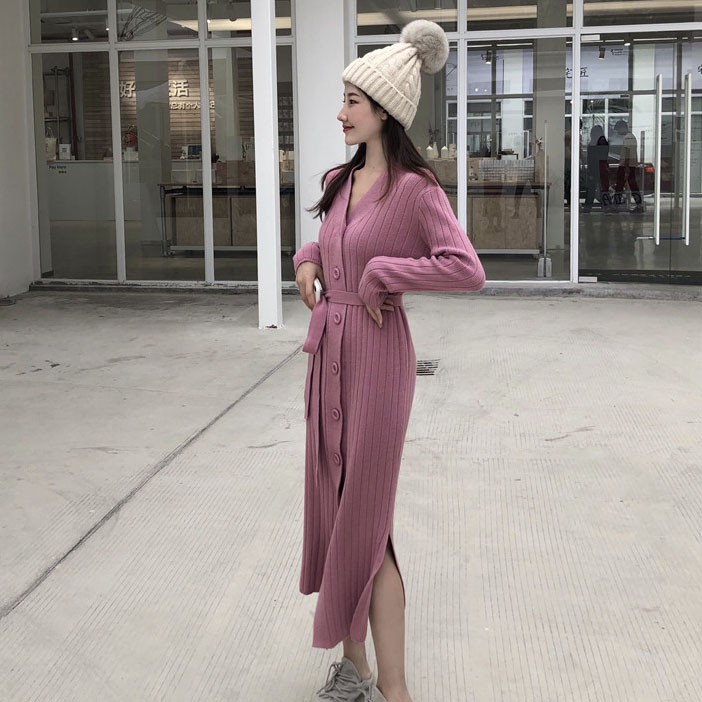 女裝秋冬2018新款顯高顯瘦長款開衫紐扣腰帶系帶V領開叉連衣裙女