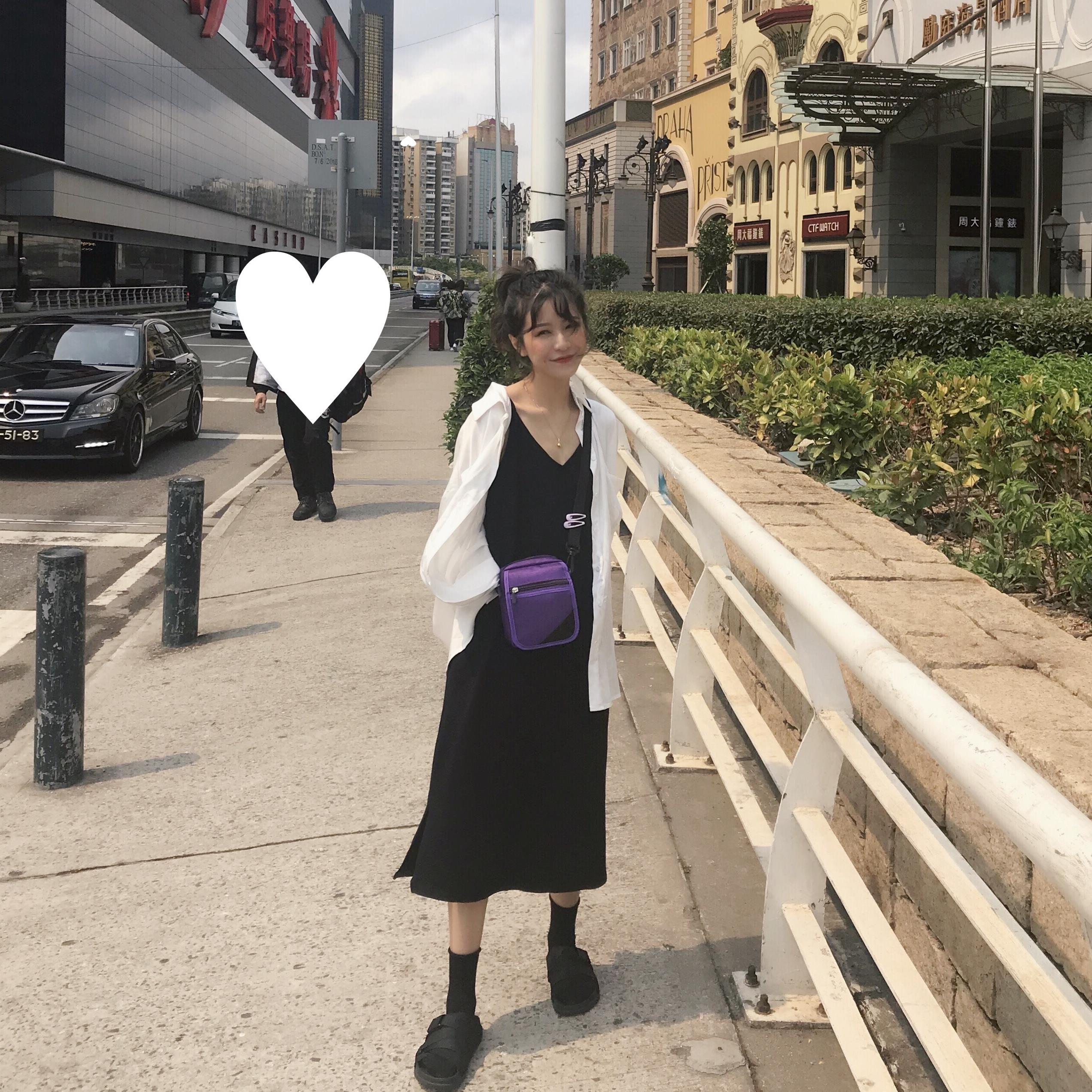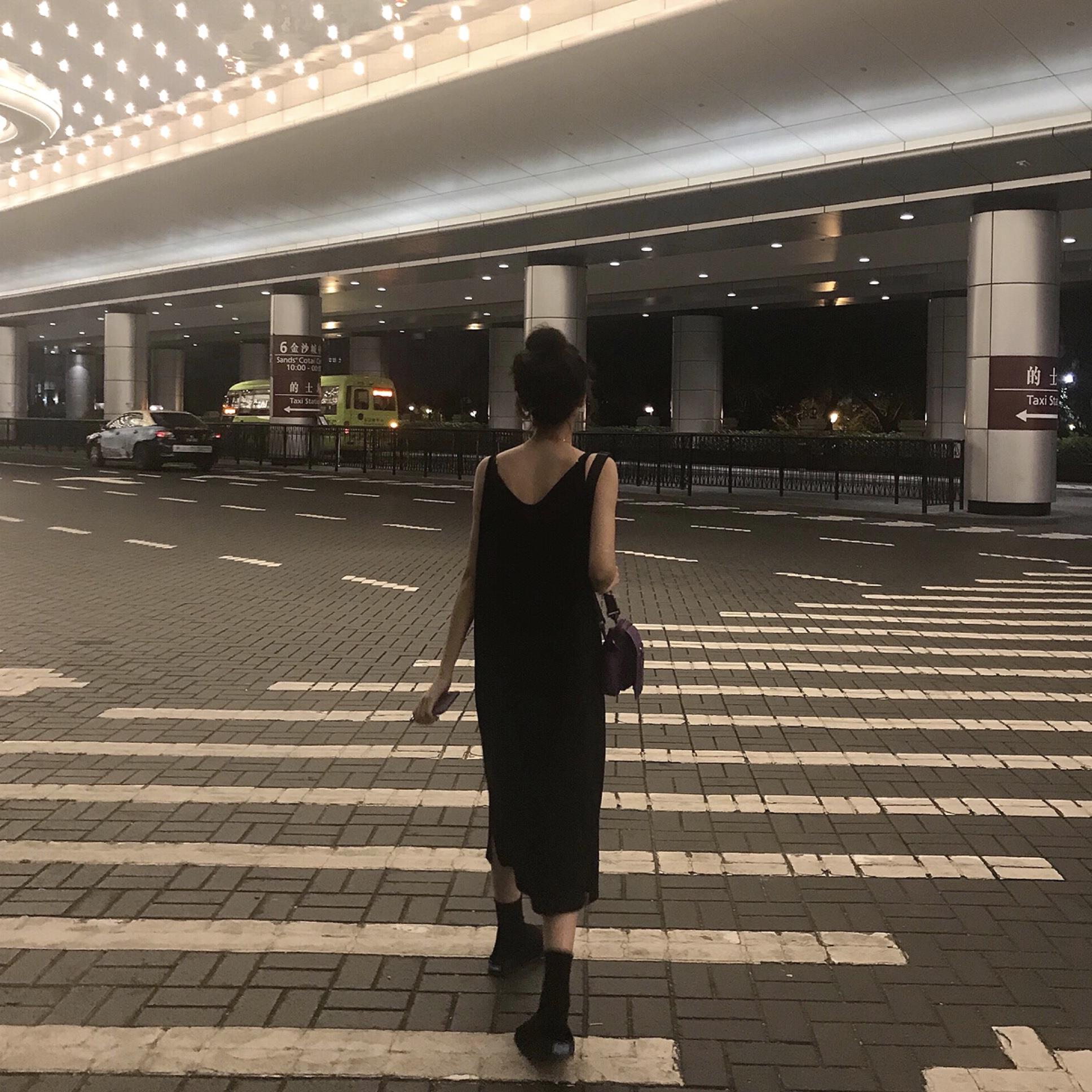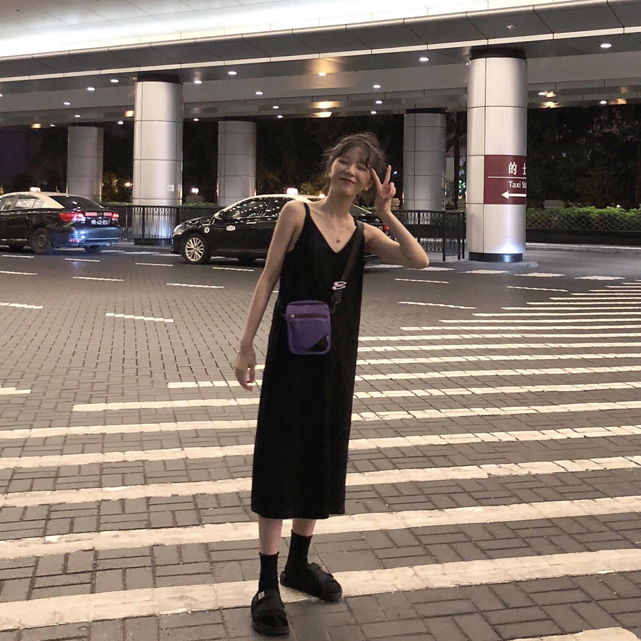 復古黑色吊帶背心女百搭外穿內搭寬松開衩長款韓版秋季打底連衣裙