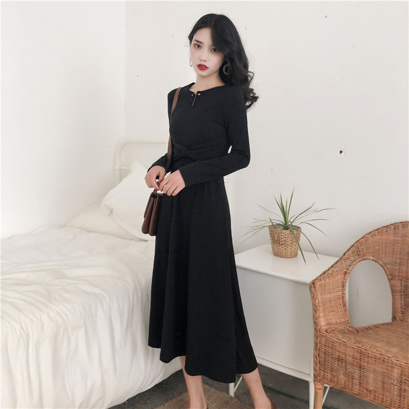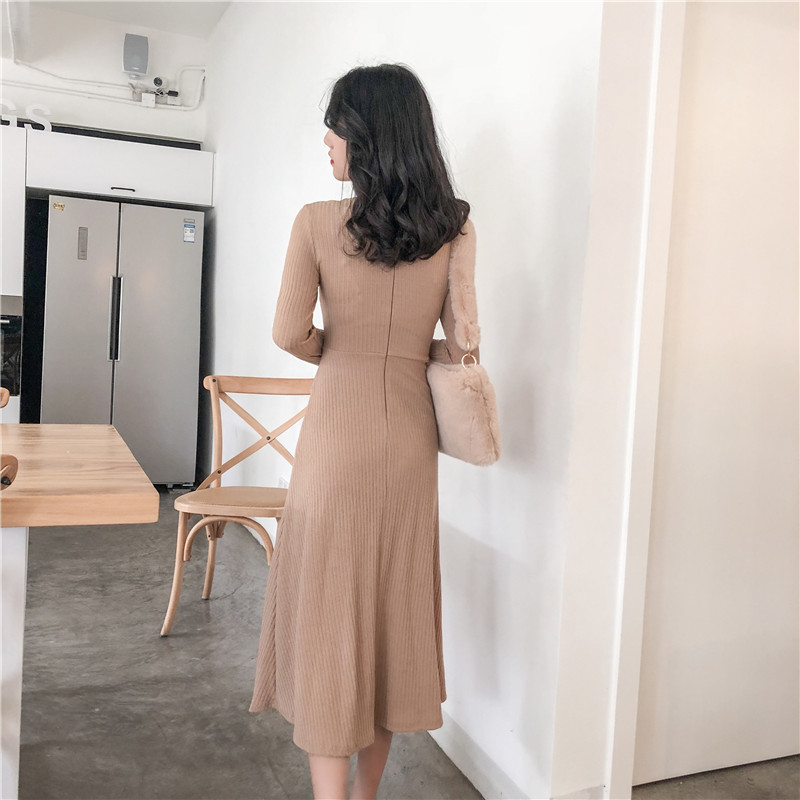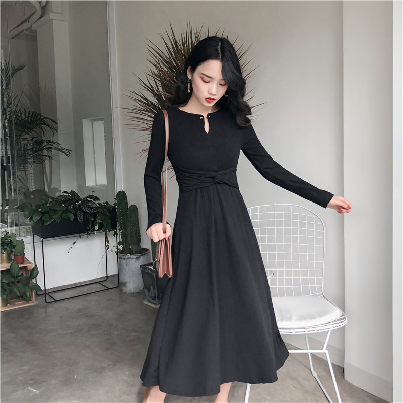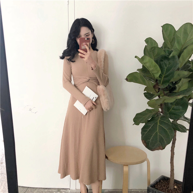 女秋裝2018新款裙子時尚韓版氣質高領修身顯瘦純色百搭長袖連衣裙
