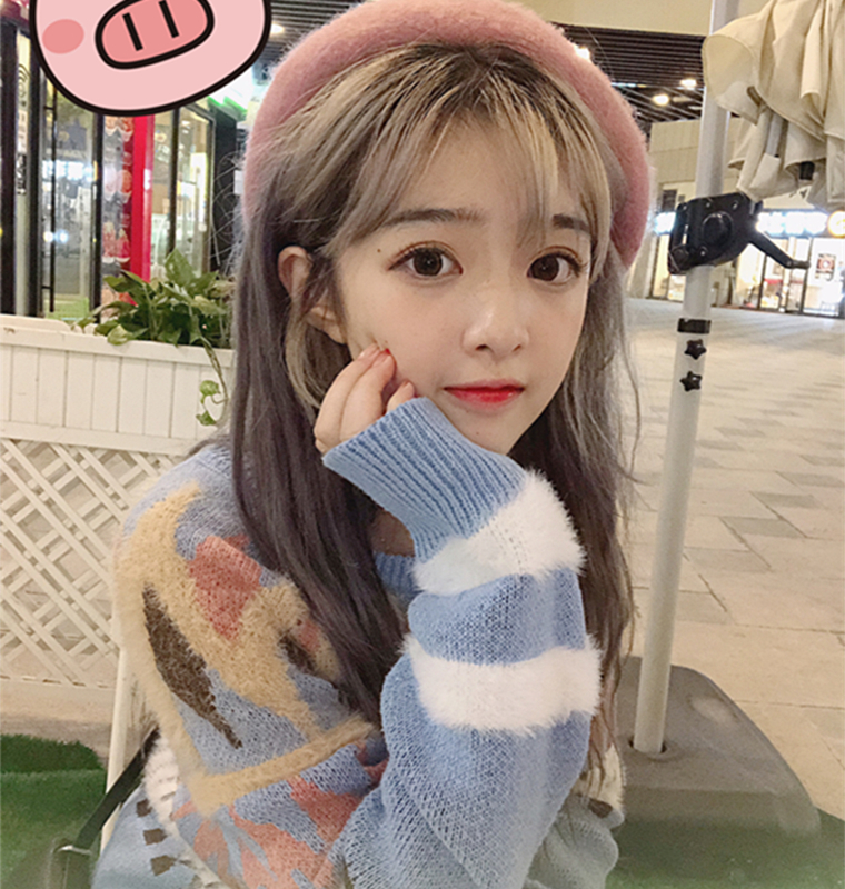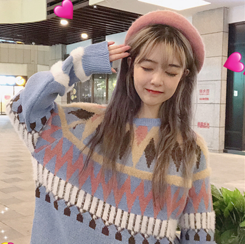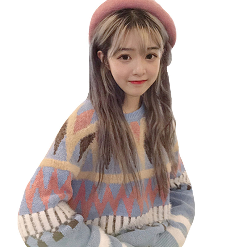 / 秋冬女裝韓版小清新菱形格紋寬松套頭長袖針織衫學生休閑毛衣上衣