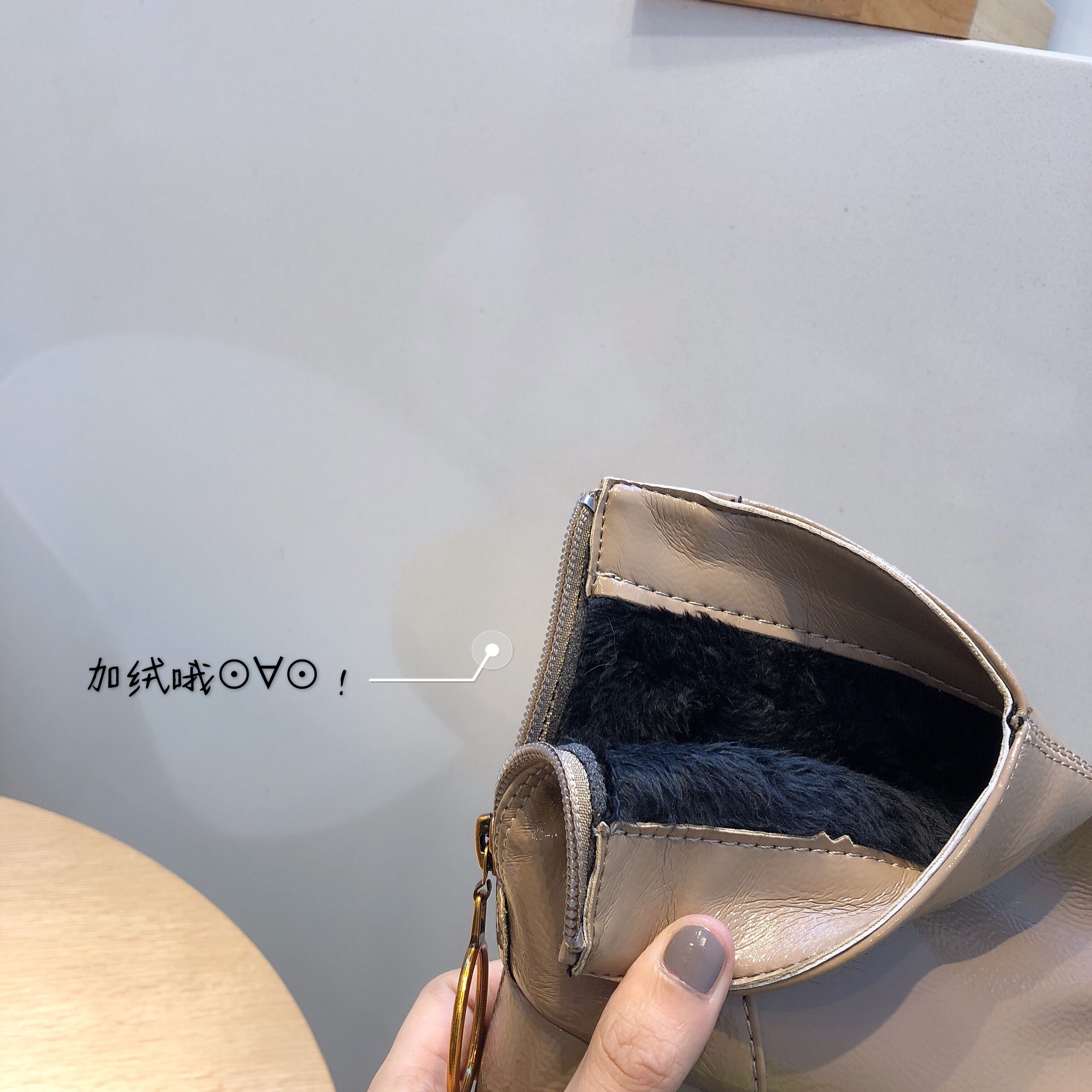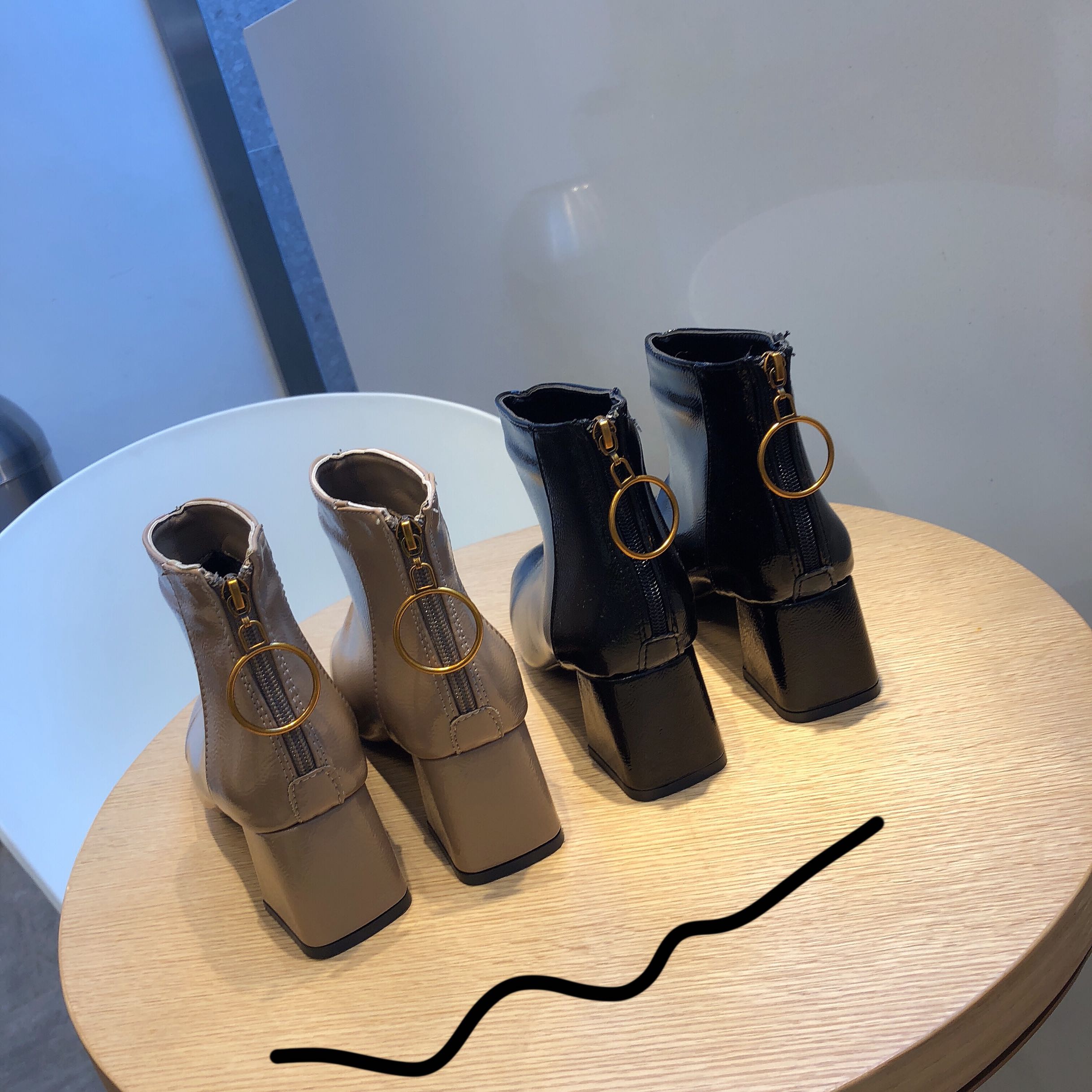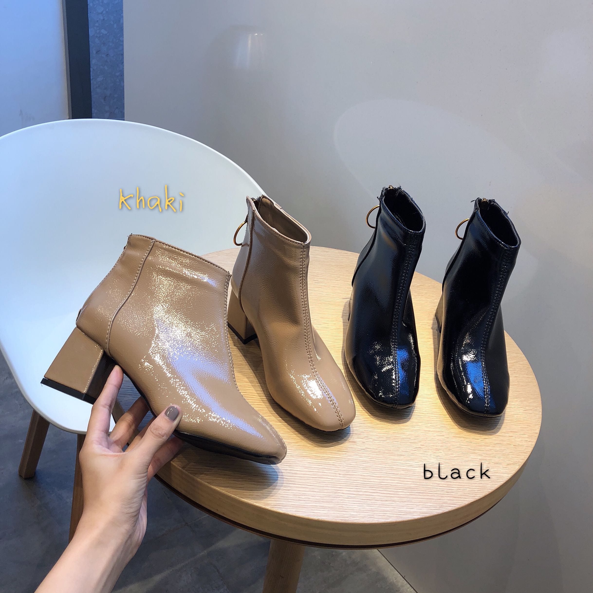 / 網紅歐美新款chic時尚冬方頭百搭漆皮粗跟高跟女瘦腿短靴及踝靴潮