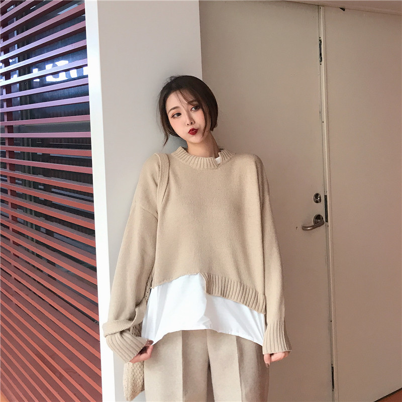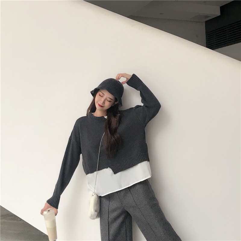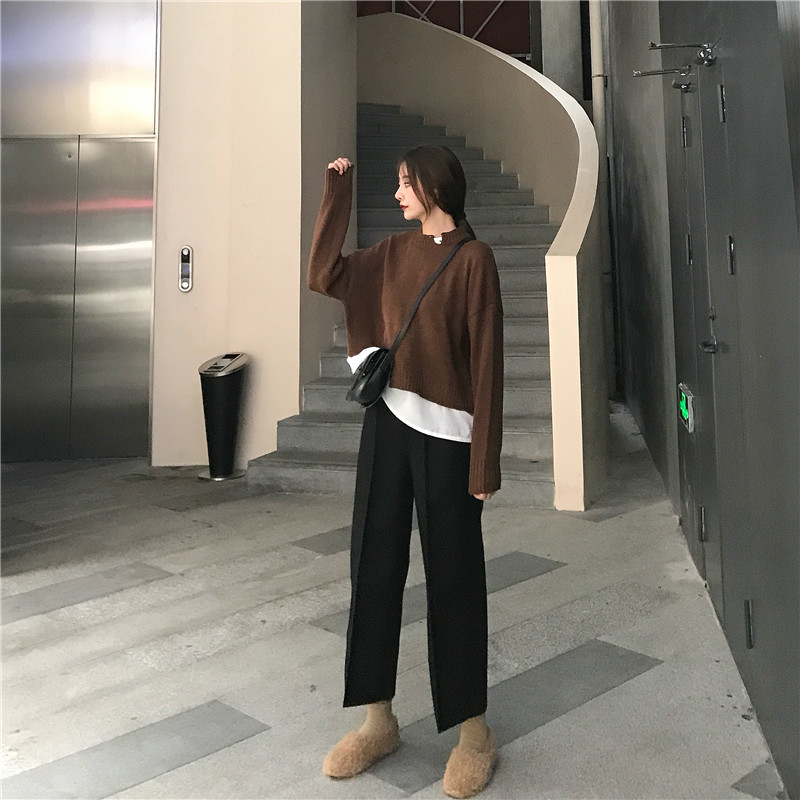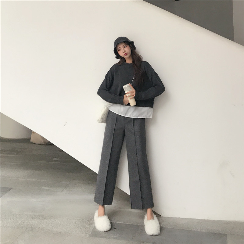 新款高腰呢子顯瘦闊腿褲不規則領口假兩件寬松針織毛衣時尚套裝女