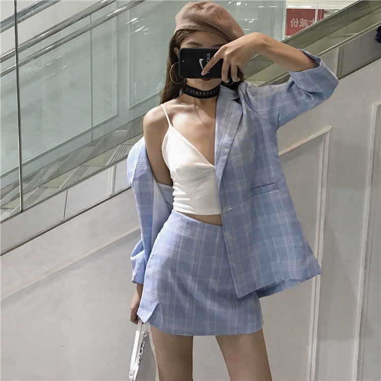 / 春季女裝新款韓國寬松顯瘦格子小西裝外套+格子短裙褲套裝分開拍
