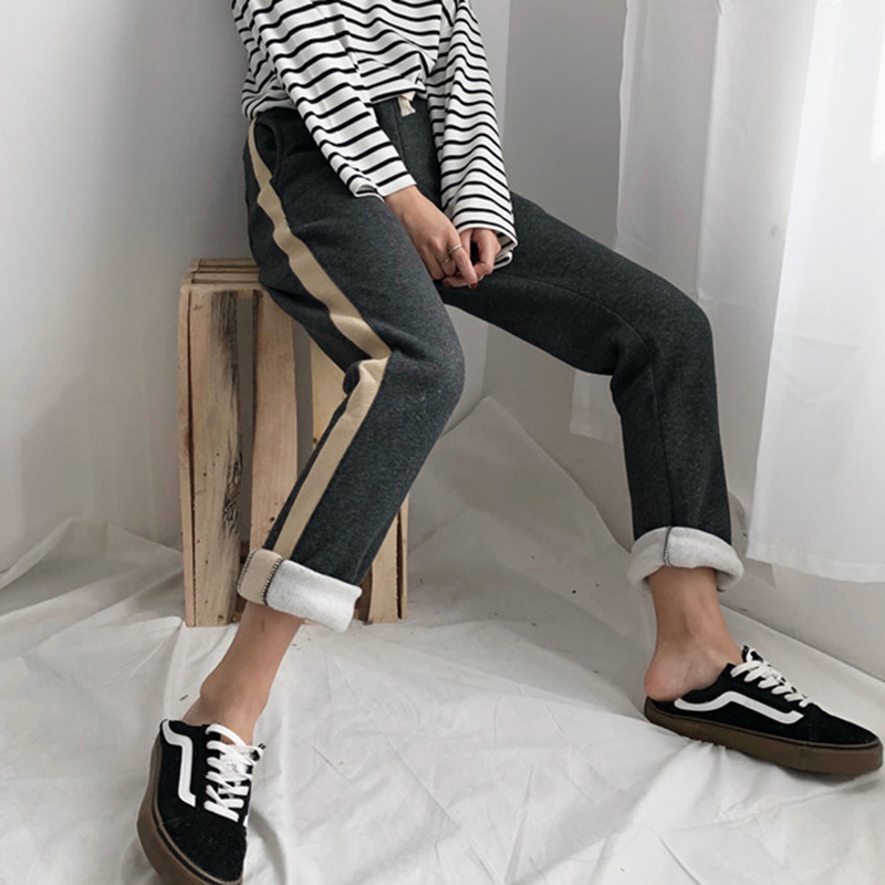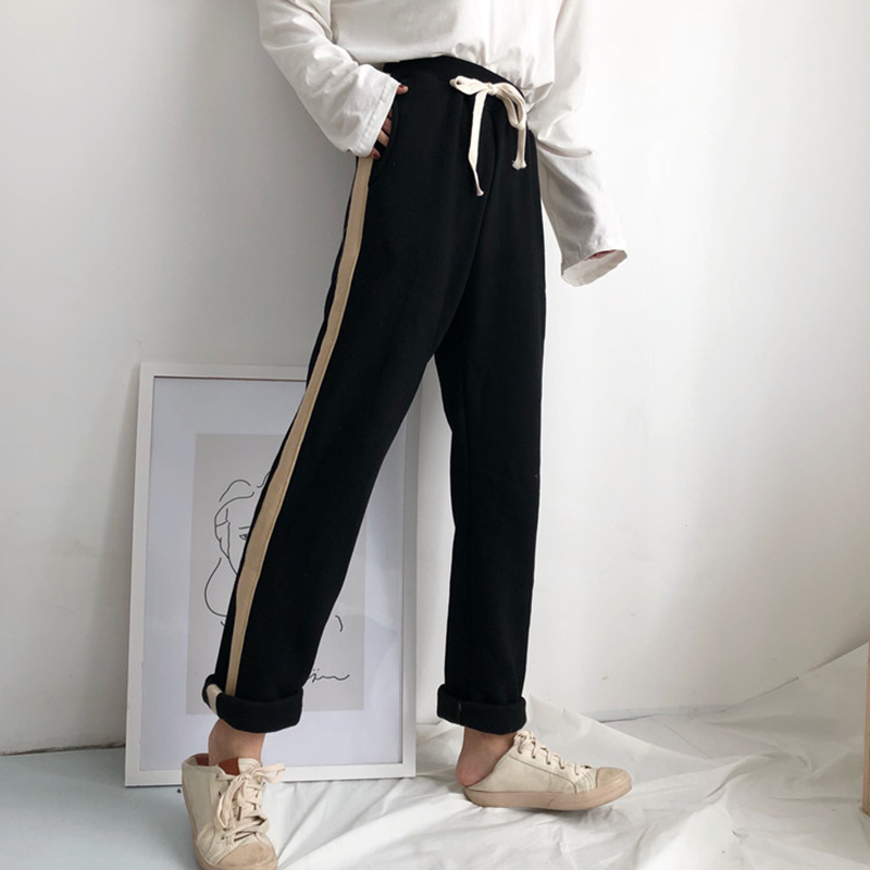 / 秋冬女裝2018新款韓版條紋拼色抽繩休閑褲高腰寬松顯瘦直筒長褲子