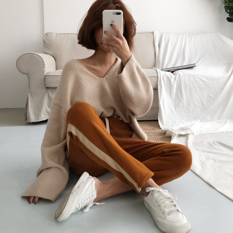 秋冬女裝2018新款韓版條紋拼色抽繩休閑褲高腰寬松顯瘦直筒長褲子